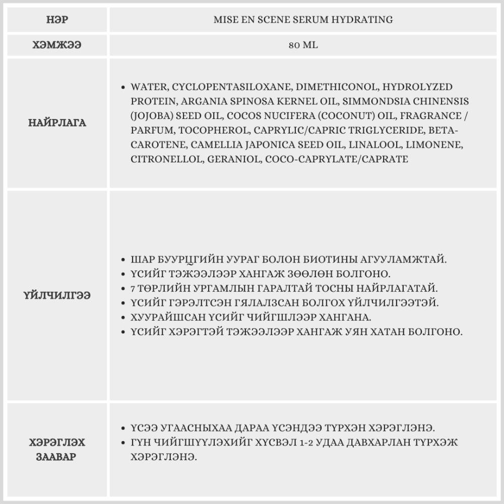 MISE EN SCENE SERUM HYDRATING / ҮСНИЙ ТЭЖЭЭЛ /