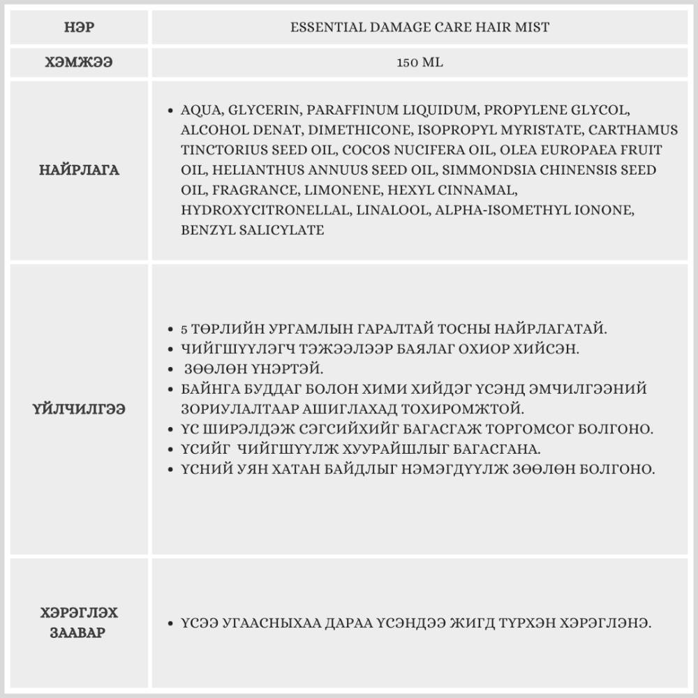 ESSENTIAL DAMAGE CARE HAIR MIST / ҮСНИЙ МИСТ /