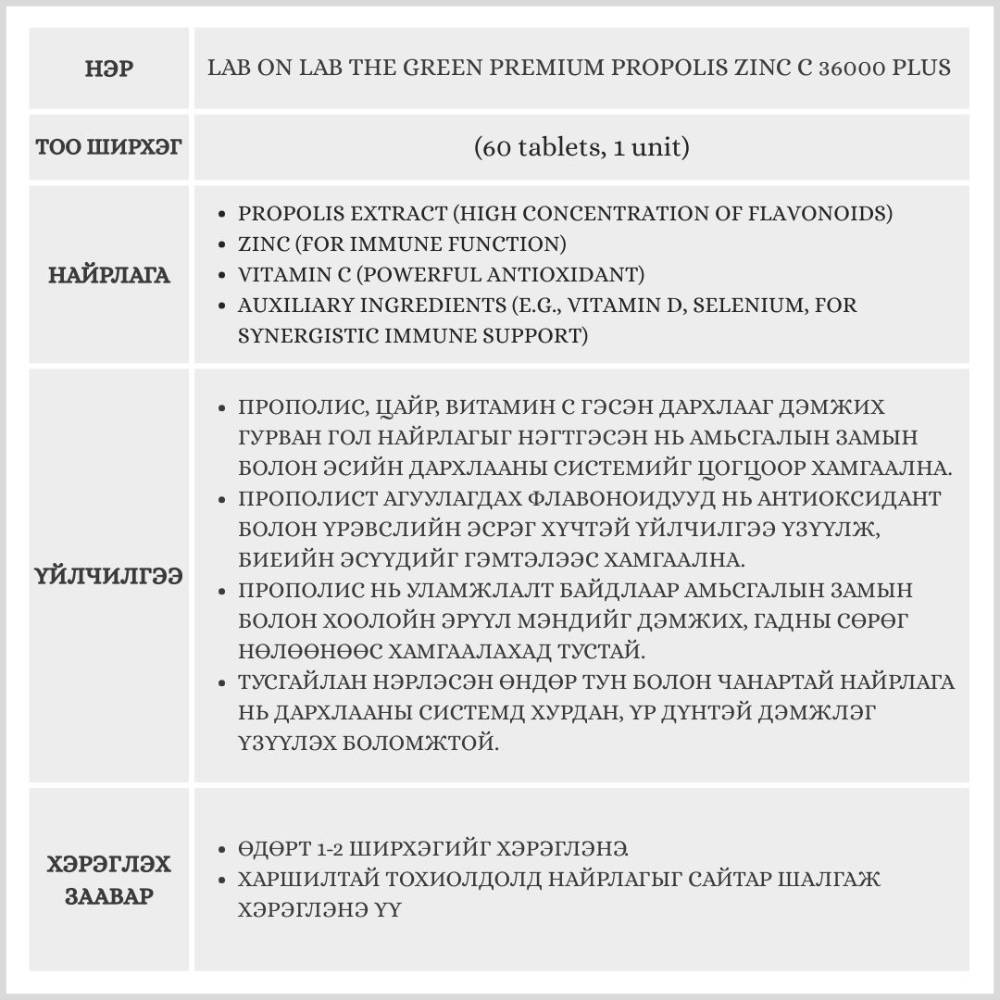 Дархлааны системийг хүчтэй дэмжих зорилготой, Прополис, Цайр (Zinc), болон Витамин С зэрэг гурван гол найрлагыг өндөр тунгаар хослуулсан нэмэлт тэжээл юм.