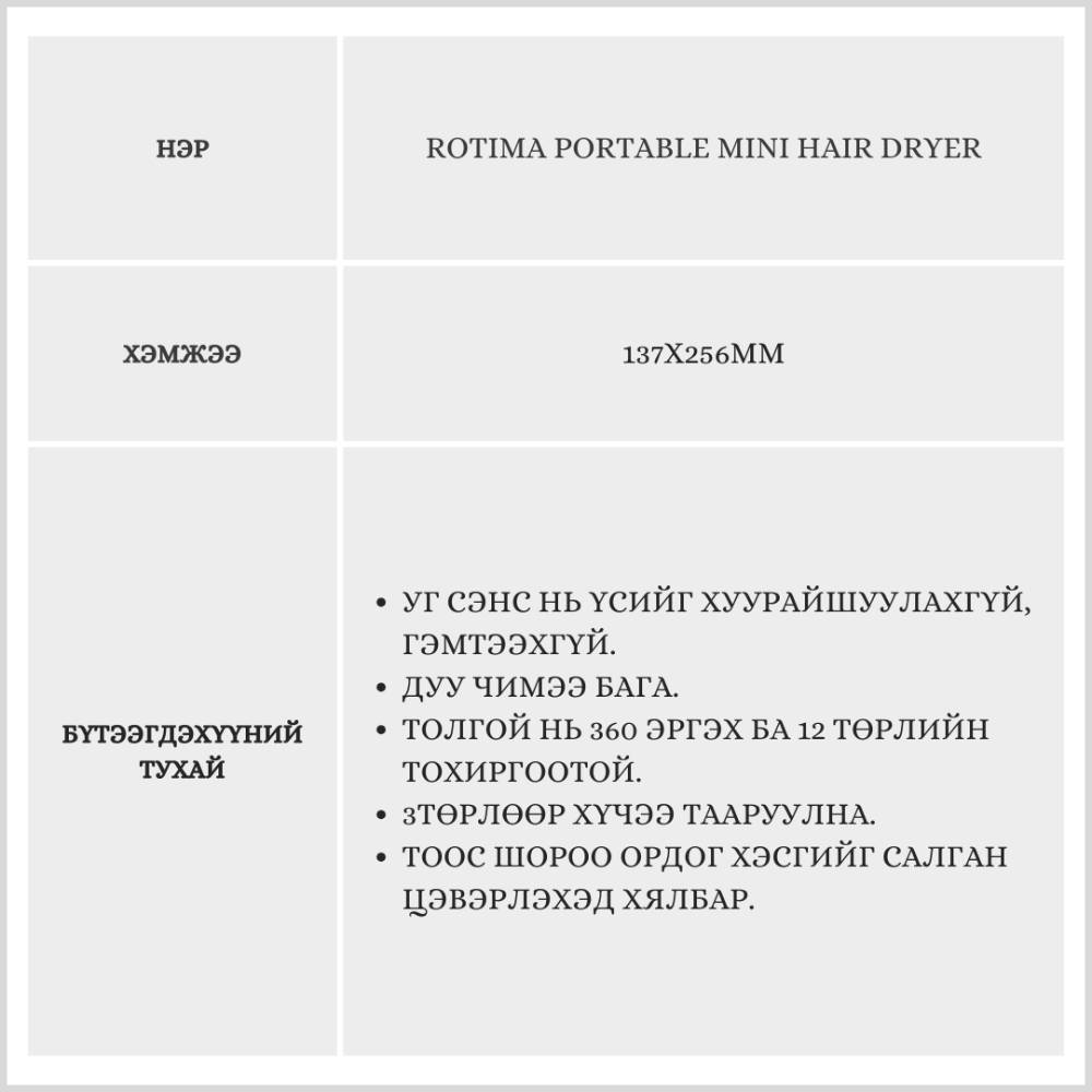 Rotima Portable Mini Hair Dryer /Үсний сэнс/
