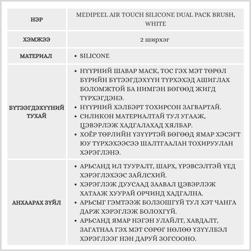 Арьс арчилгааны бүтээгдэхүүнийг түрхэх, тараах зориулалттай силикон багс. Нян бактери үржүүлэхгүй ба угааж цэвэрлэн хадгалахад хялбар.