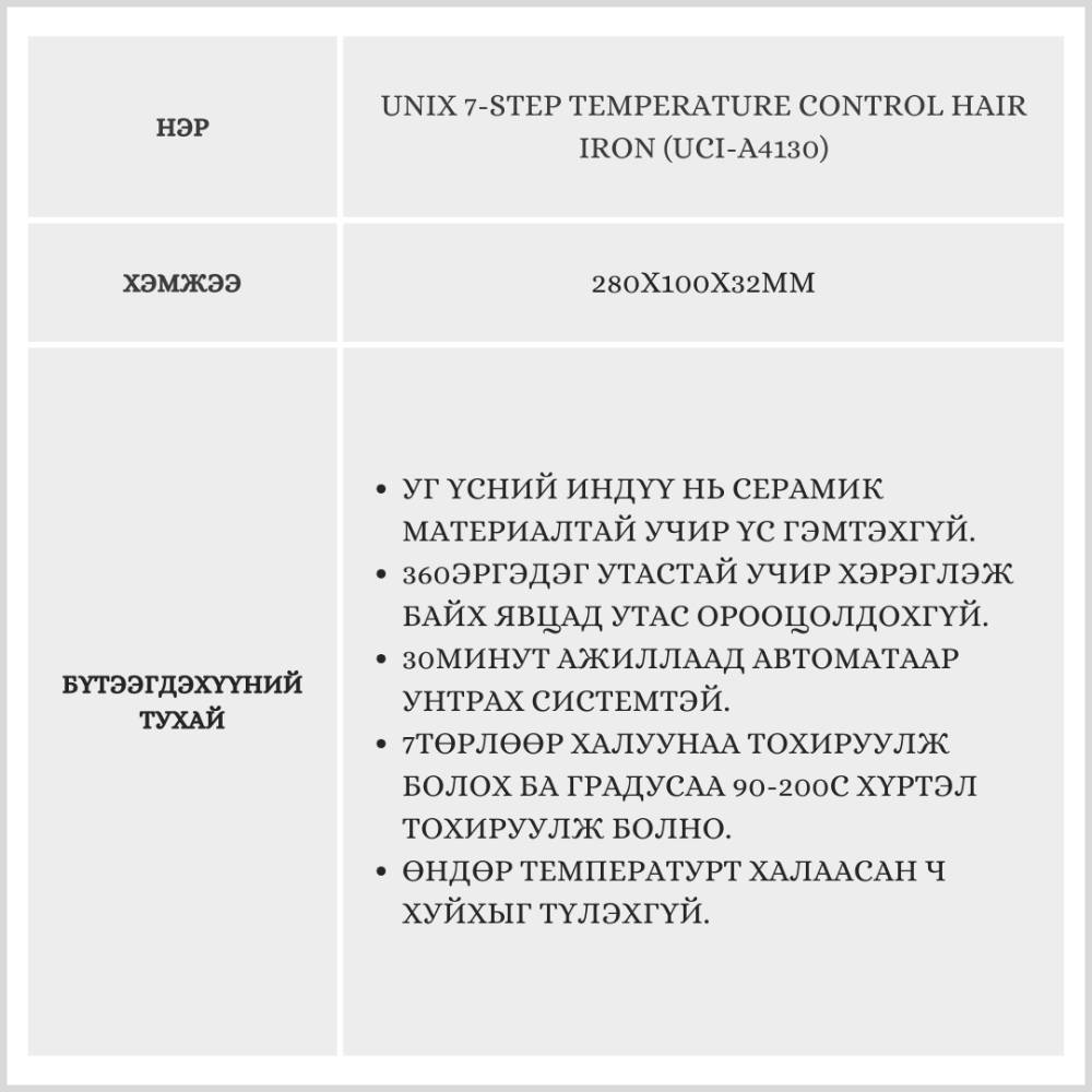 UNIX 7-Step Temperature Control Hair Iron (UCI-A4130) /Үсний индүү/