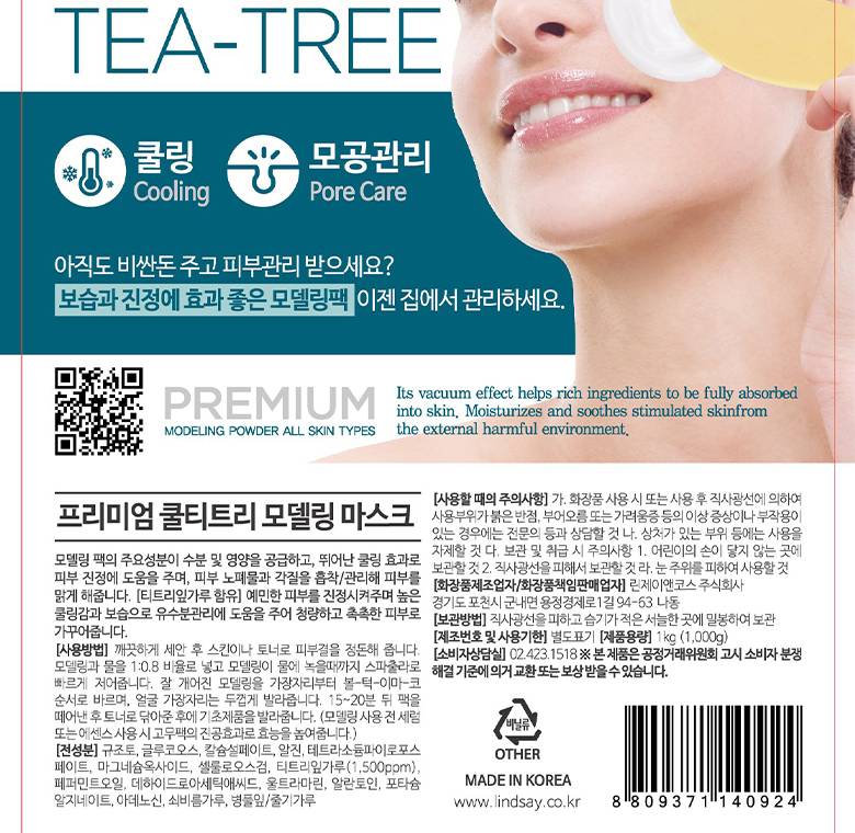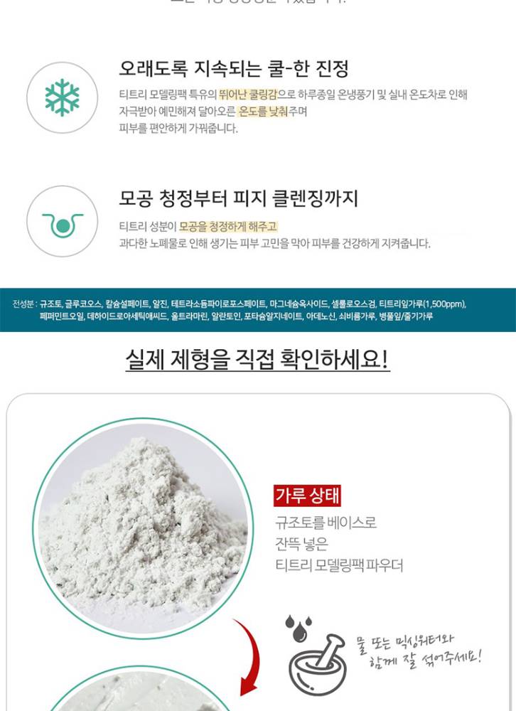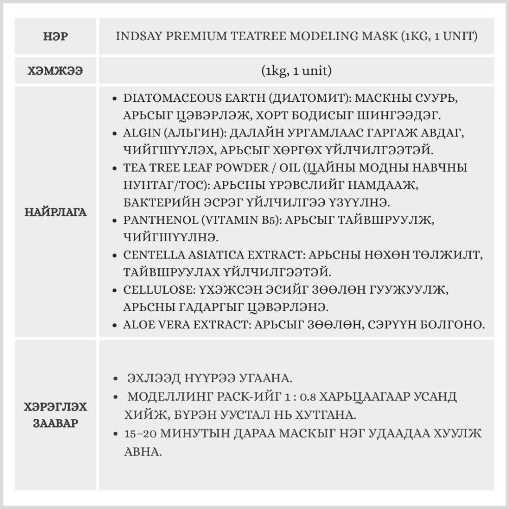 Цайны модны (Teatree) идэвхтэй найрлагыг агуулсан, арьсыг гүн цэвэрлэх, тайвшруулах, мөн чийгшүүлэх үйлчилгээтэй салон маягийн зуурдаг маск (Modeling Mask) юм.