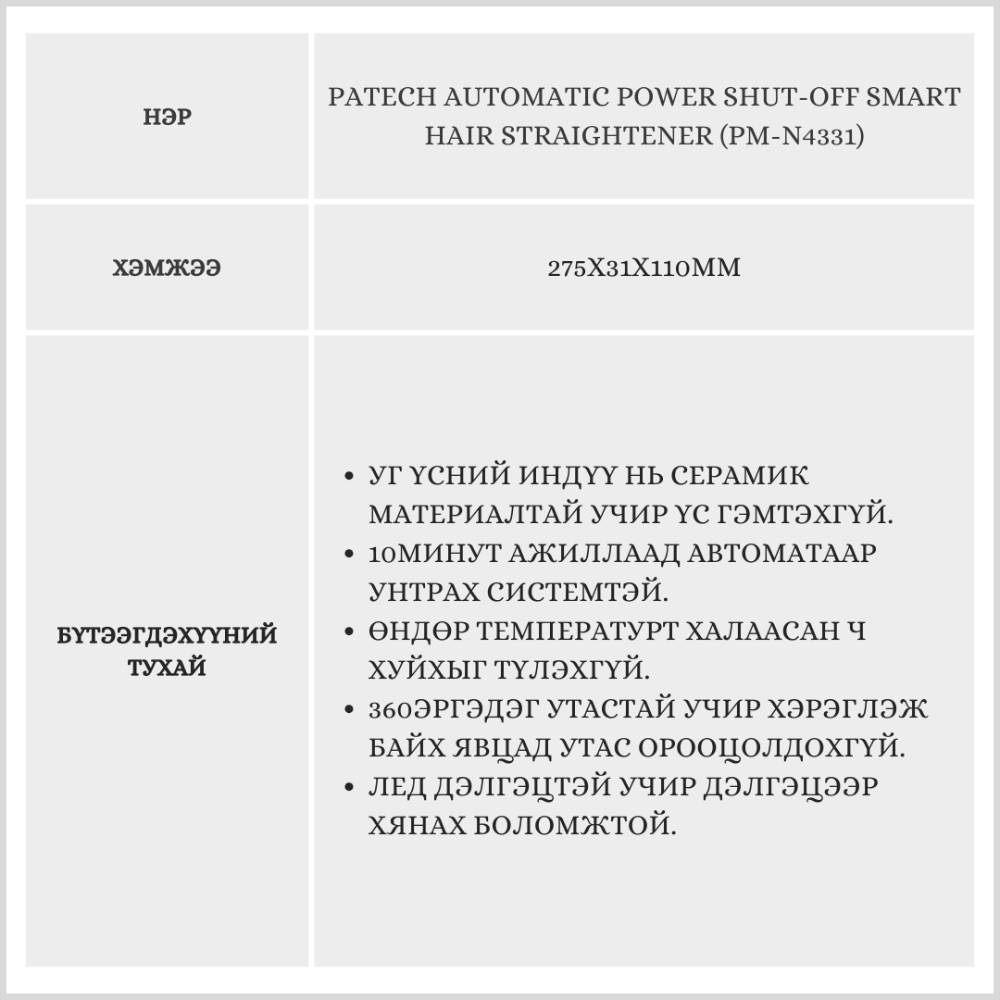 PATECH Automatic Power Shut-off Smart Hair Straightener (PM-N4331) /Үсний индүү/