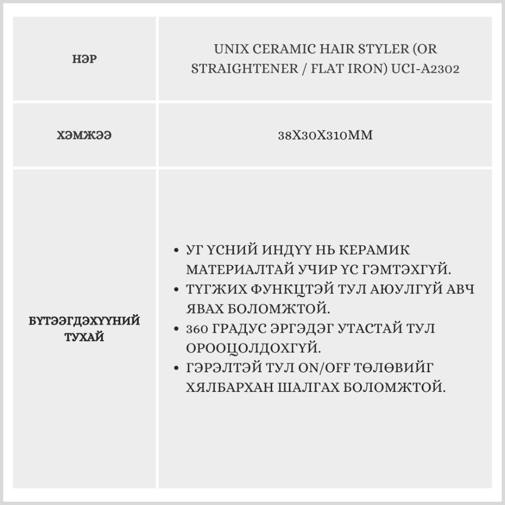 UNIX Ceramic Hair Styler (or Straightener / Flat Iron) UCI-A2302 /Үсний индүү/
