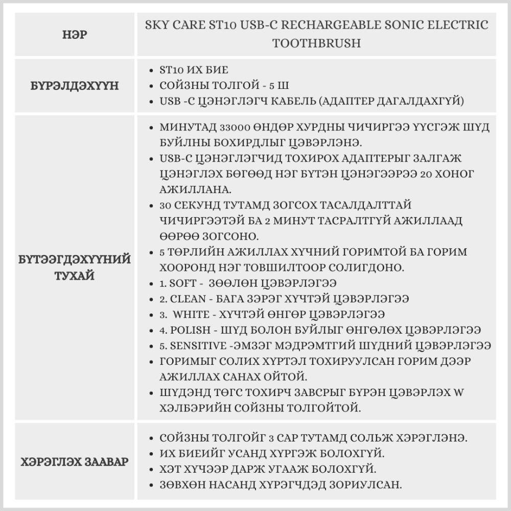 SKY CARE ST10 USB-C Rechargeable Sonic Electric Toothbrush, 1ш (5ш толгой) /Автомат сойз/