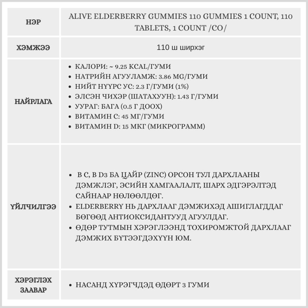 " В С, В D3 ба цайр (zinc) орсон тул дархлааны дэмжлэг, эсийн хамгаалалт, шарх эдгэрэлтэд сайнаар нөлөөлдөг. Elderberry нь дархлааг дэмжихэд ашиглагддаг бөгөөд антиоксидантууд агуулдаг. Өдөр тутмын хэрэглээнд тохиромжтой дархлааг дэмжих бүтээгдэхүүн юм."