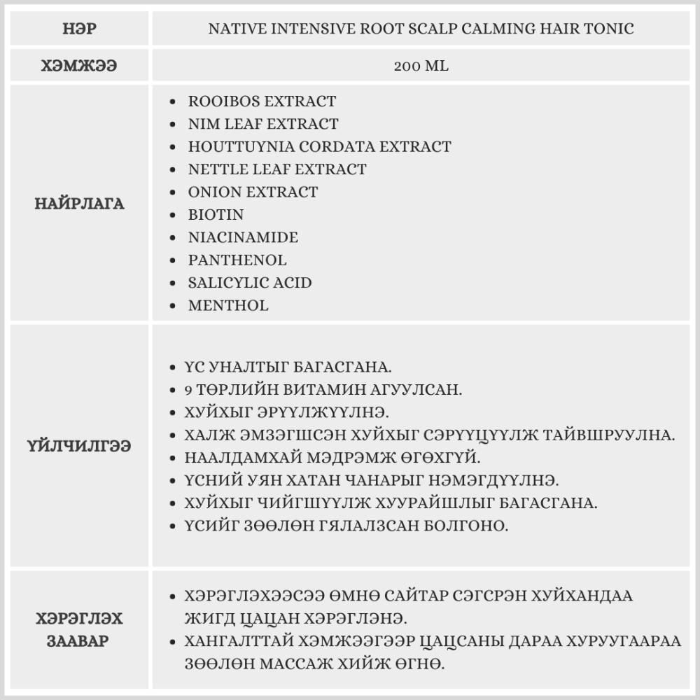 NATIVE INTENSIVE ROOT SCALP CALMING HAIR TONIC / ХУЙХНЫ ТОНИК /