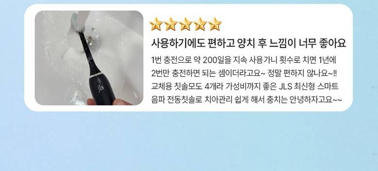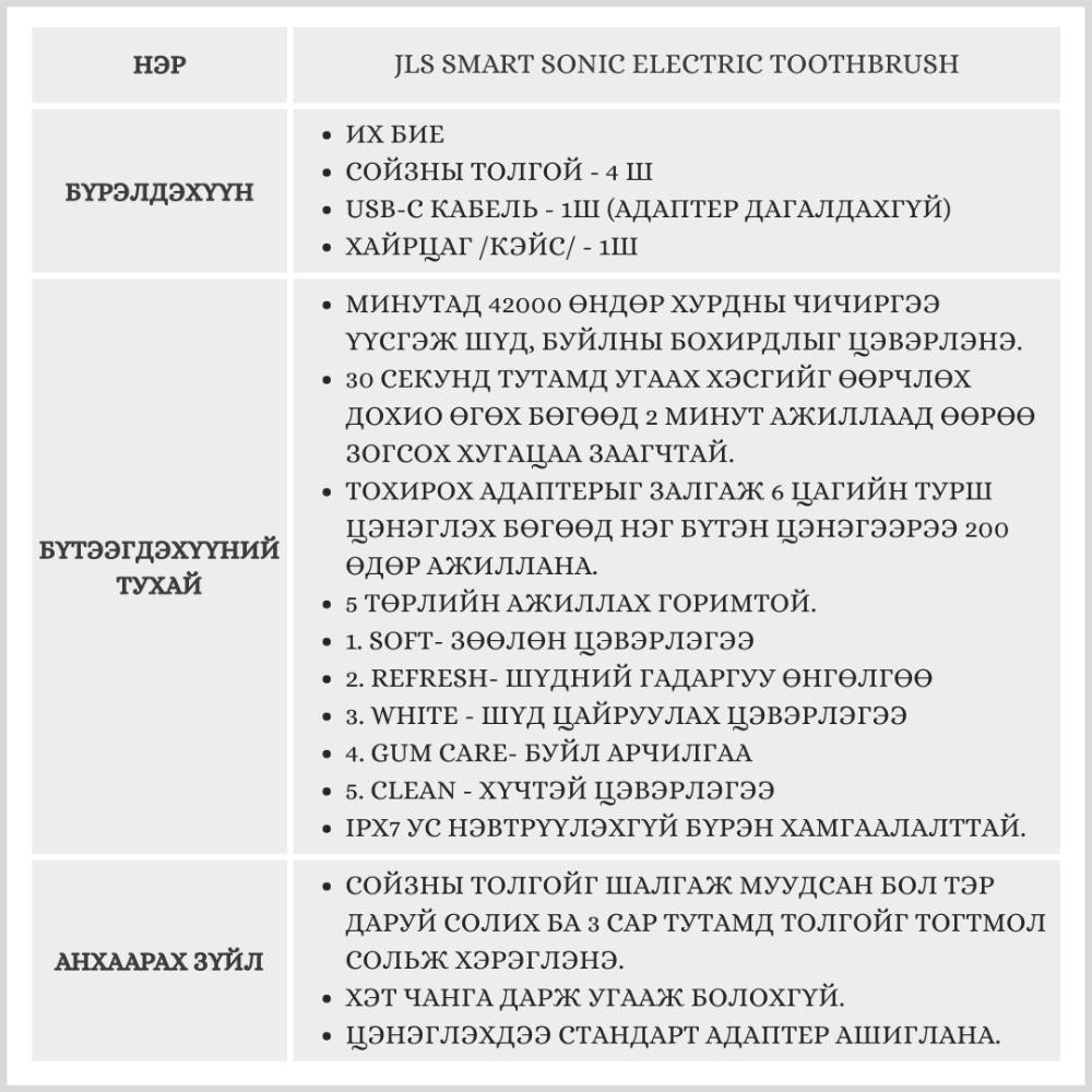 JLS Smart Sonic Electric автомат шүдний сойз нь минутад 42000 чичиргээ үүсгэх замаар шүд, буйлыг цэвэрлэх ба 5 төрлийн хүчний горимтой. Бүрэн цэнэгээрээ 200 цаг ажиллана. Ус нэвтрүүлдэггүй бүрэн усны хамгаалалттай тул усанд орж байхдаа ч шүдээ угаах боломжтой.