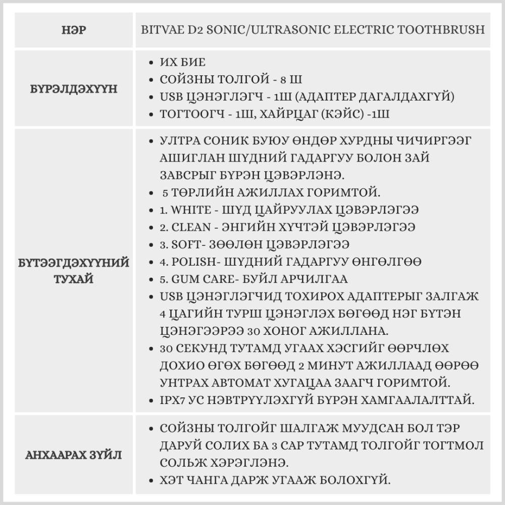 Bitvae D2 Sonic/Ultrasonic Electric автомат шүдний сойз нь ултра соник буюу өндөр хурдны чичиргээгээр шүд, буйлны бохирдлыг цэвэрлэх ба 5 төрлийн ажиллах горимтой. IPX7 ус нэвтрүүлэхгүй бүрэн хамгаалалттай бөгөөд хамгаалалтын хайрцаг болон сойз тогтоогч дагалдах тул хэрэглэхэд хялбар.