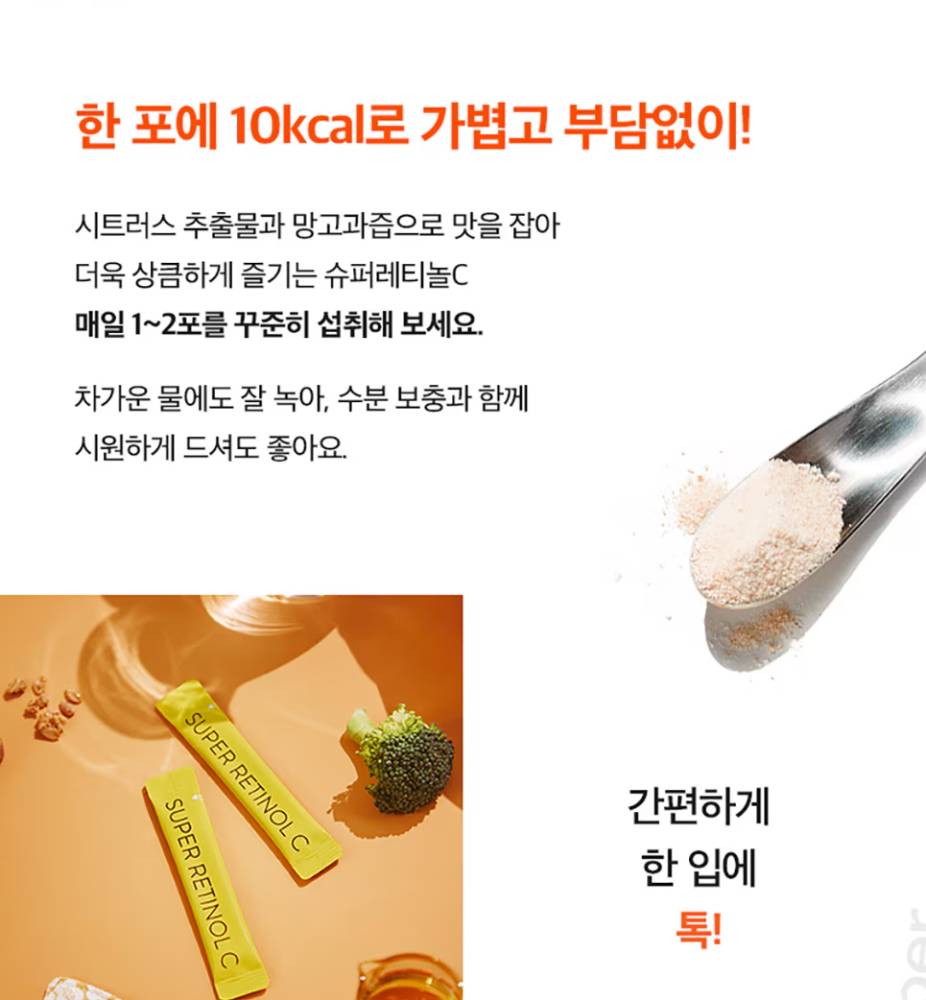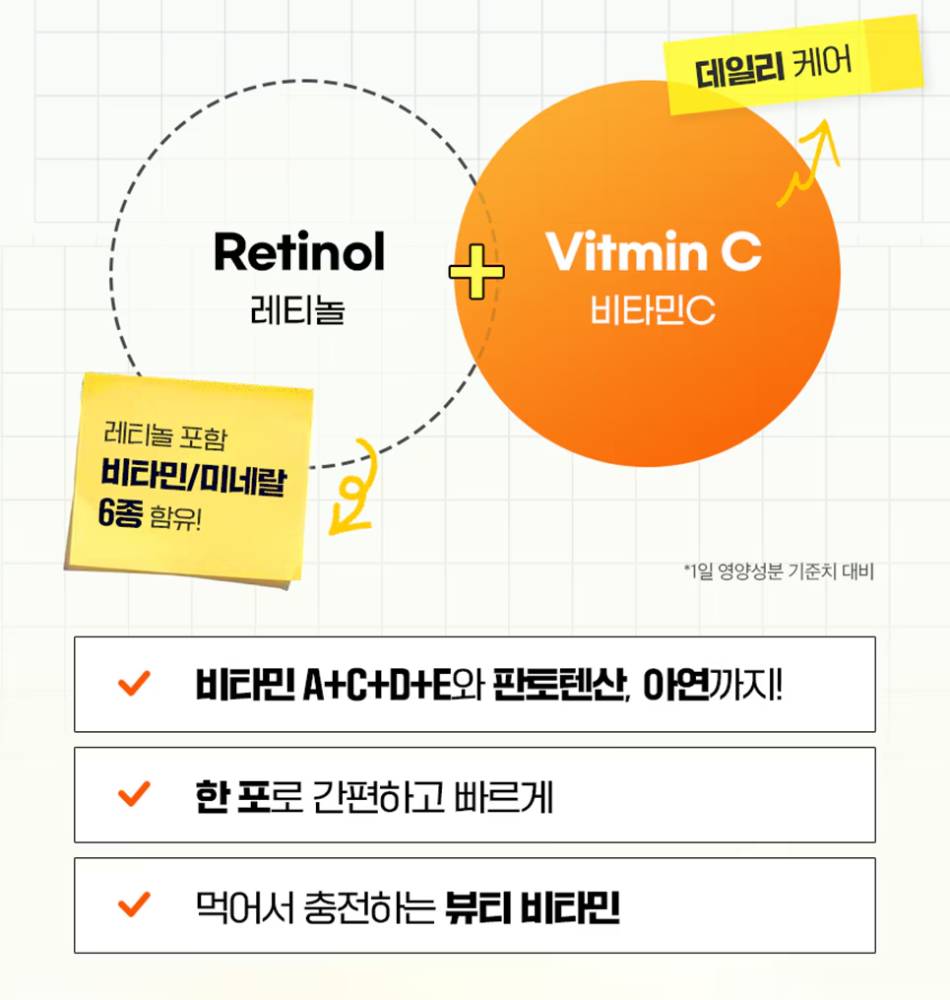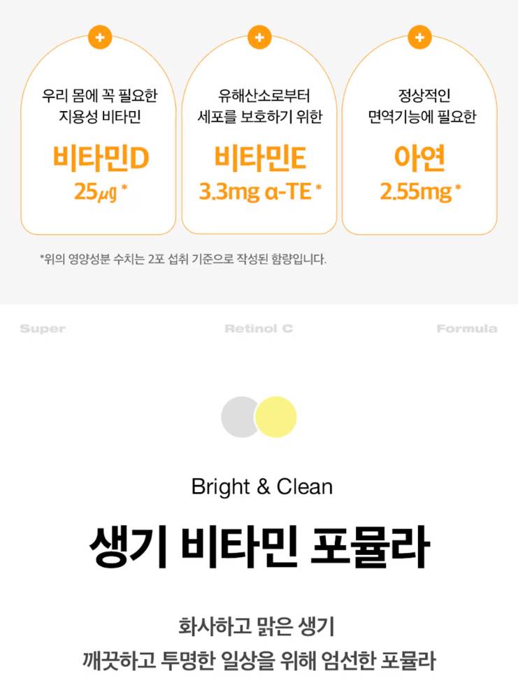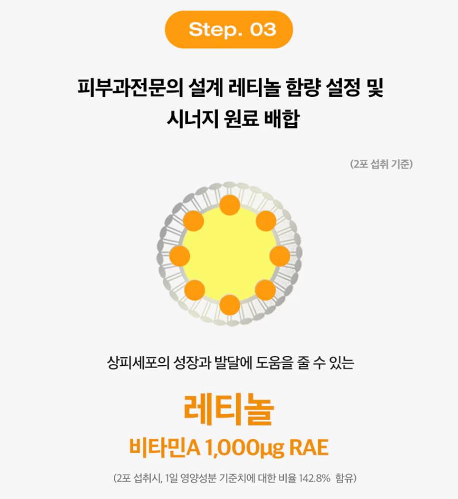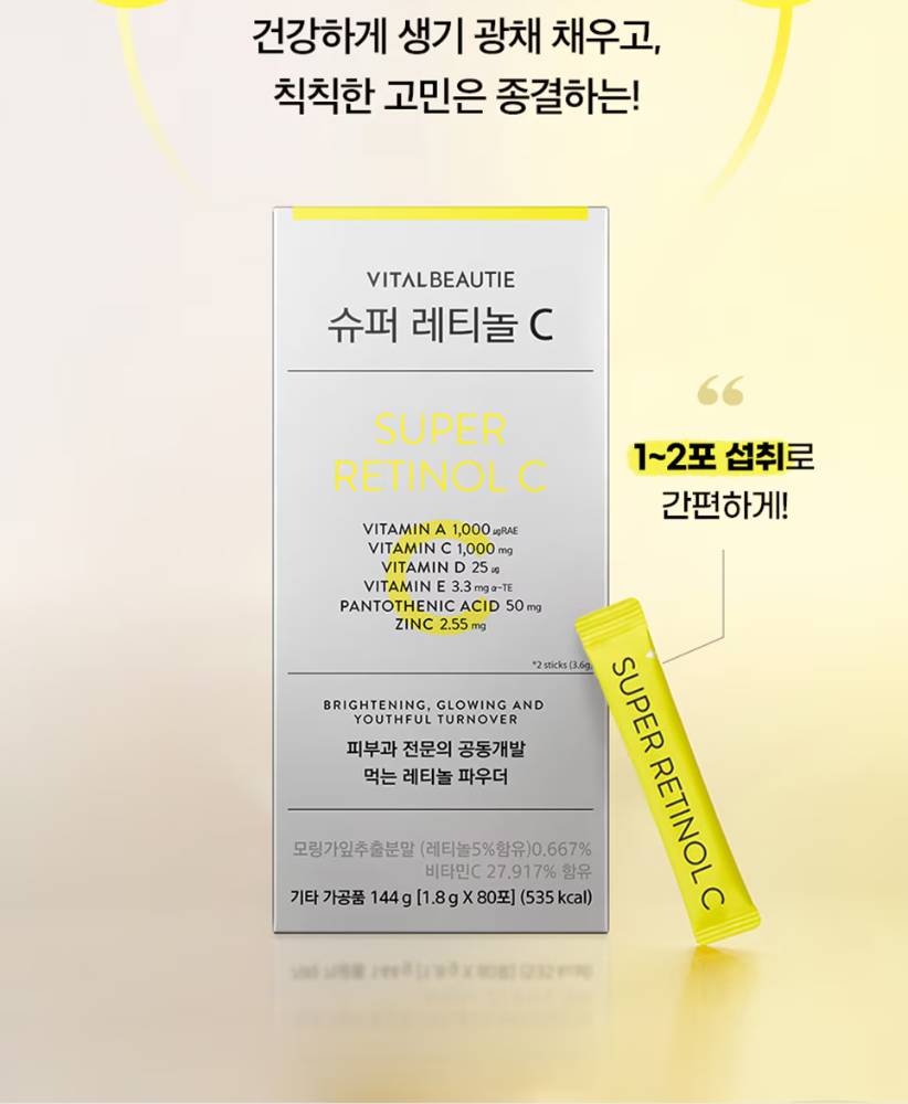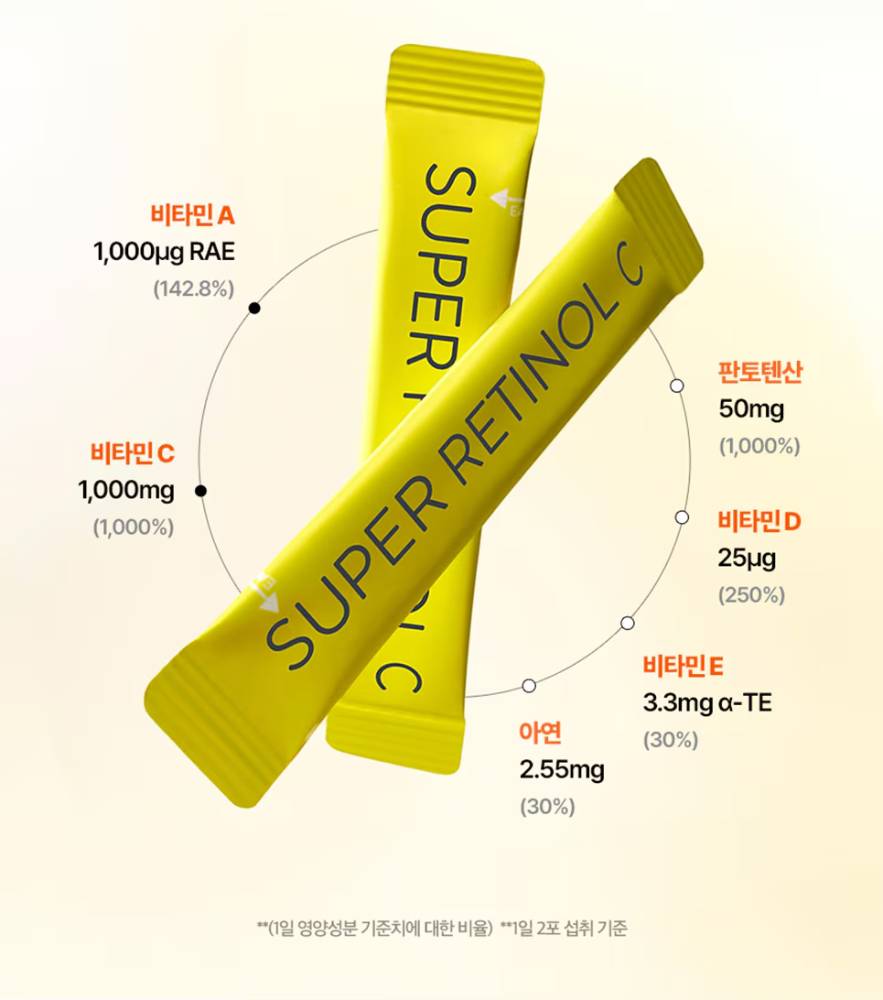 Гоо сайхны нэмэл бүтээгдэхүүн. Ретинол (витамин A) + Витамин C + цайр зэрэгийн холимог нь арьсны өнгө сэргэх, эсийн нөхөн төлжилтийг дэмжих, “гялалзсан” арьсыг бий болгоход тусалдаг.