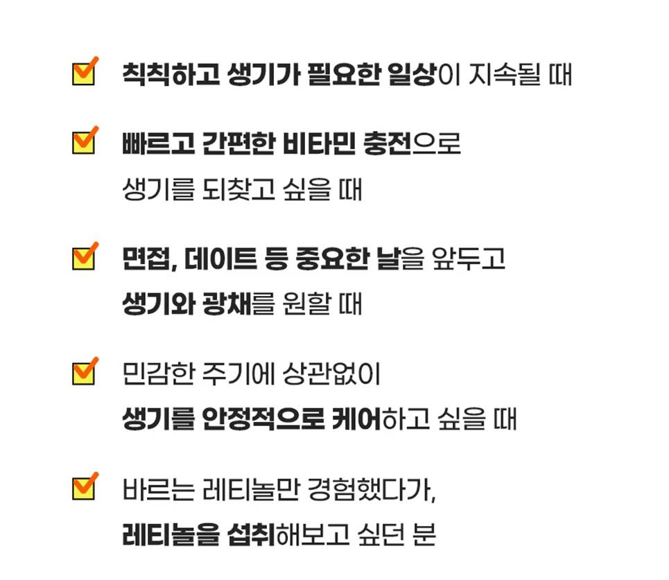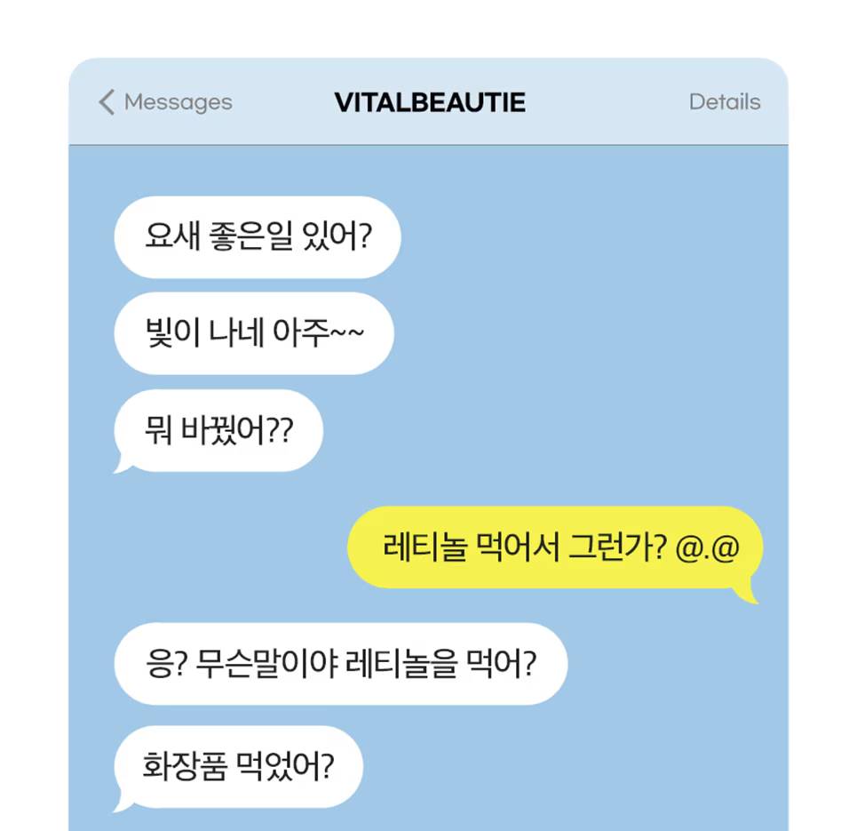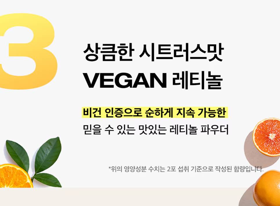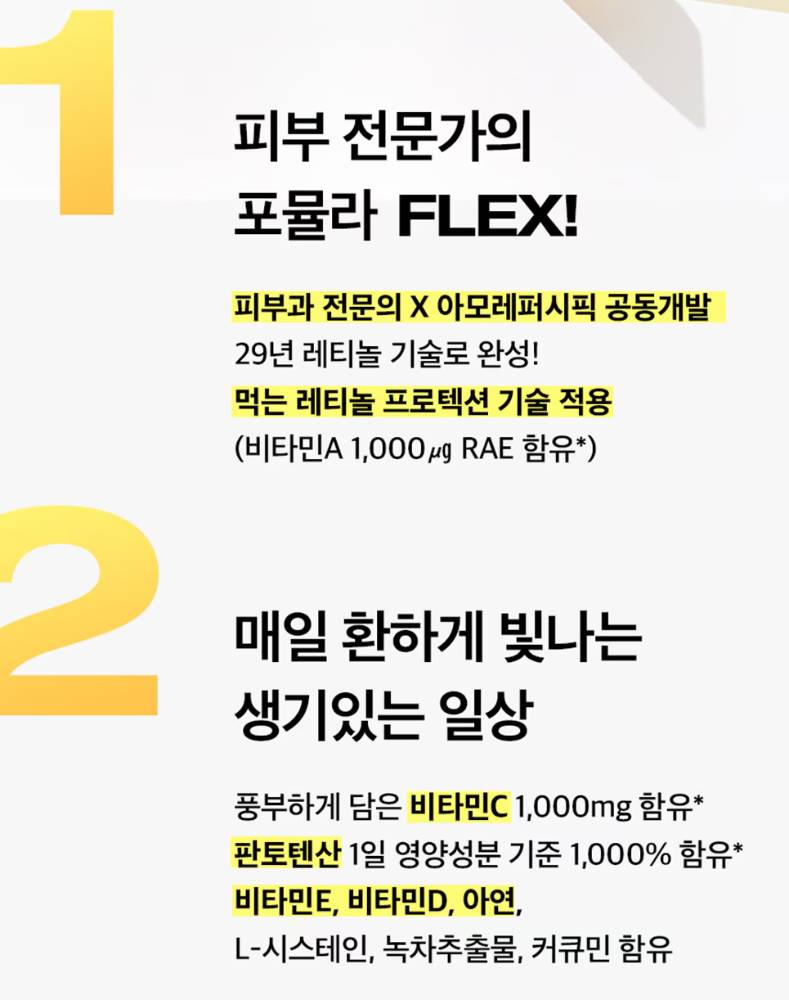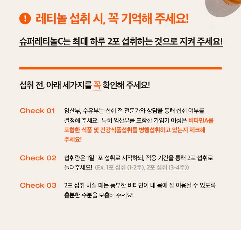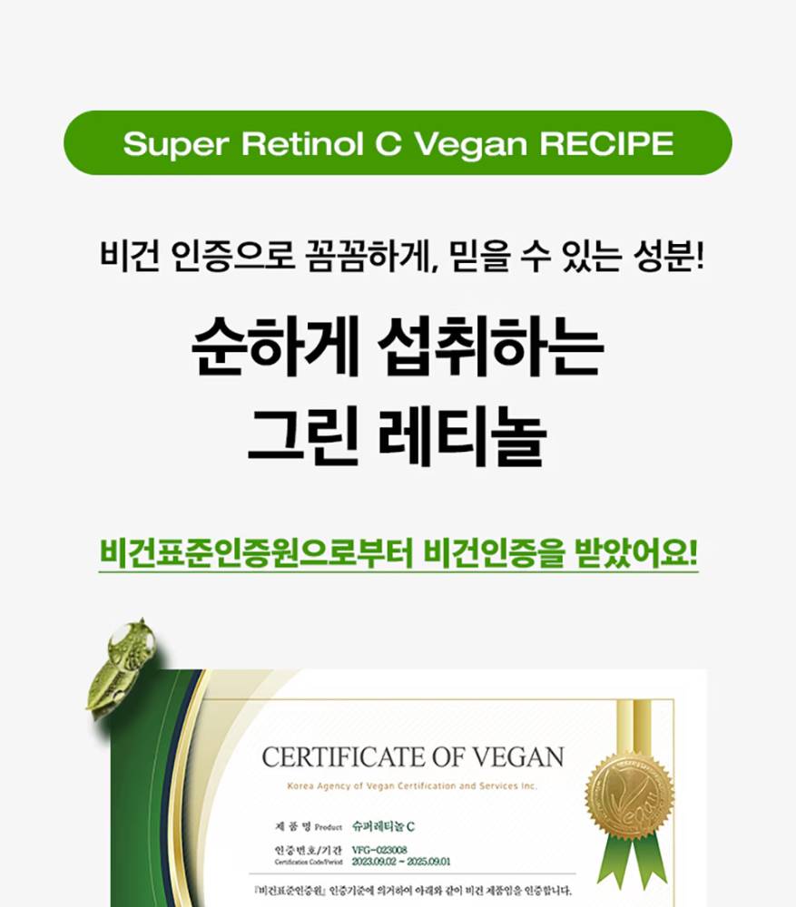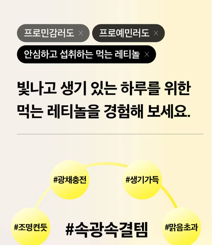 Гоо сайхны нэмэл бүтээгдэхүүн. Ретинол (витамин A) + Витамин C + цайр зэрэгийн холимог нь арьсны өнгө сэргэх, эсийн нөхөн төлжилтийг дэмжих, “гялалзсан” арьсыг бий болгоход тусалдаг.