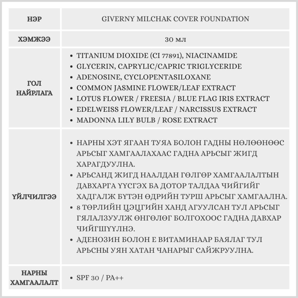 Хөнгөн бүтэцтэй арьсанд сайн наалддаг суурь будаг буюу foundation. Олон төрлийн цэцгийн ханд агуулсан тул арьсыг толигор, гэрэлтсэн болгоно. Нарны хэт ягаан туяаны хамгаалалттай бөгөөд удаан тогтоцтой.