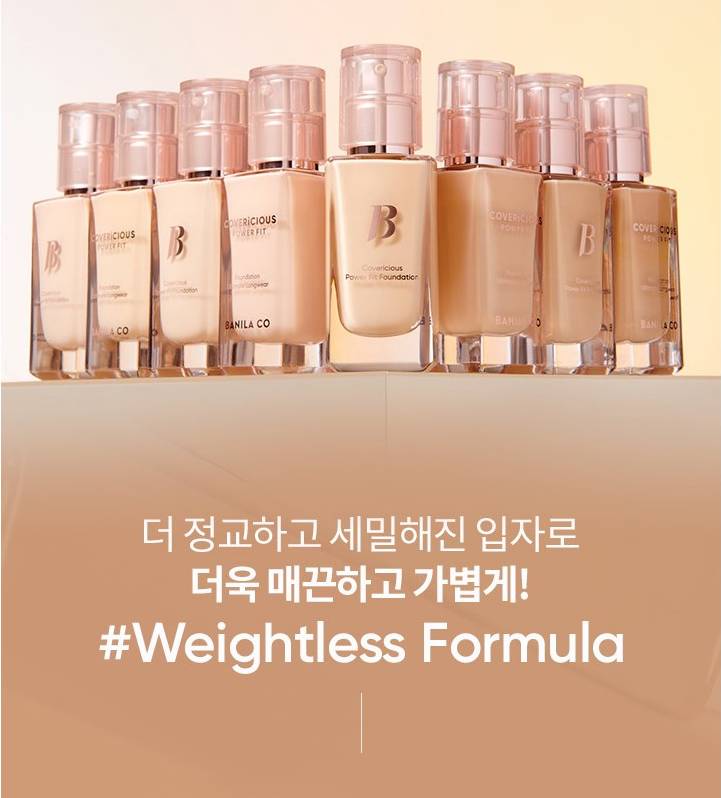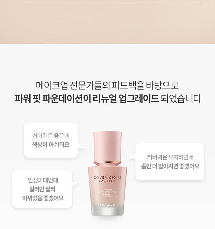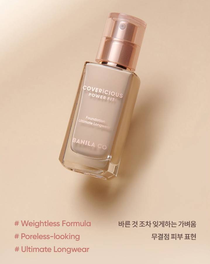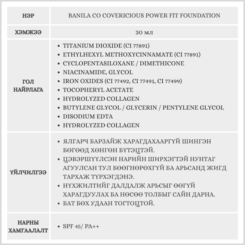 Banila Co Covericious Power Fit Foundation нь арьсыг өөгүй толигор харагдуулах ба нүхжилт болон өө сэвийг сайн дарна. Удаан тогтоцтой ба хурдан шингэх хөнгөн бүтэцтэй.