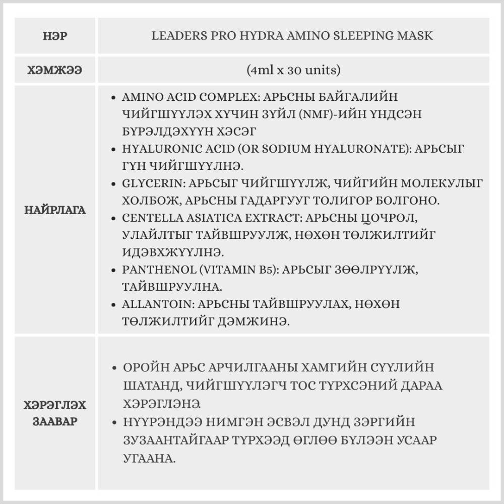 Leaders Pro Hydra Amino Sleeping Mask 4ml x 30 units /шөнийн маск/