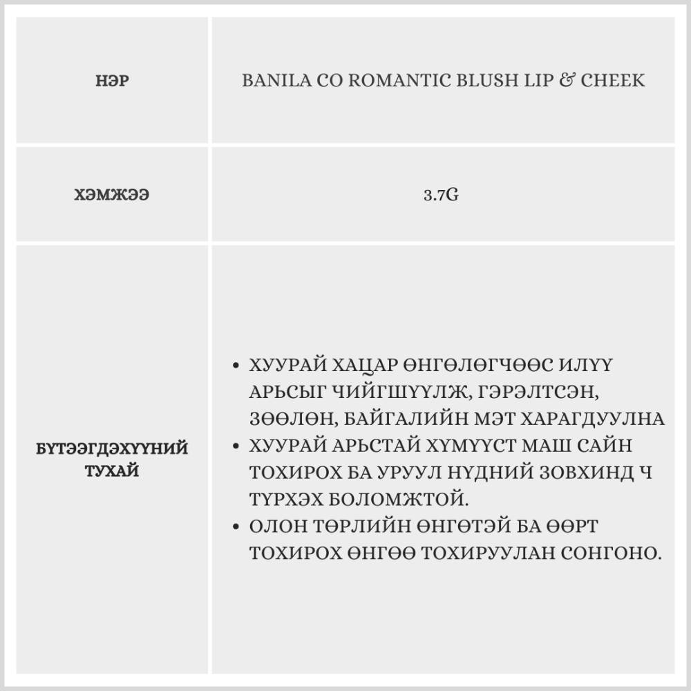 BANILA CO Romantic Blush Lip & Cheek рр3.7g , 1 piece /Хацар өнгөлөгч/
