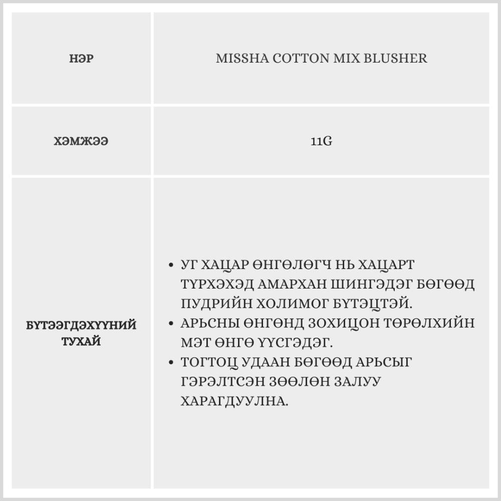 MISSHA Cotton Mix Blusher 11g /Хацар өнгөлөгч/