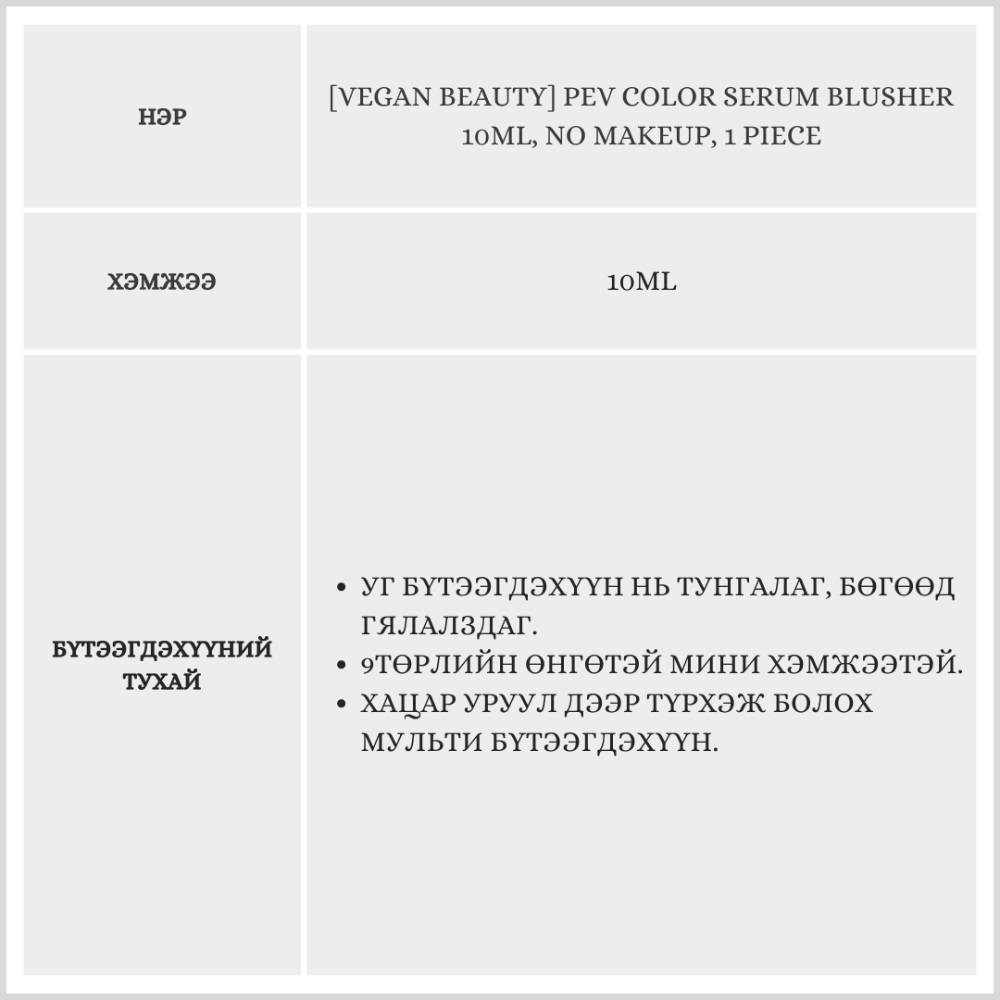 [Vegan Beauty] PEV Color Serum Blusher 10ml, No Makeup, 1 piece /Хацар өнгөлөгч/
