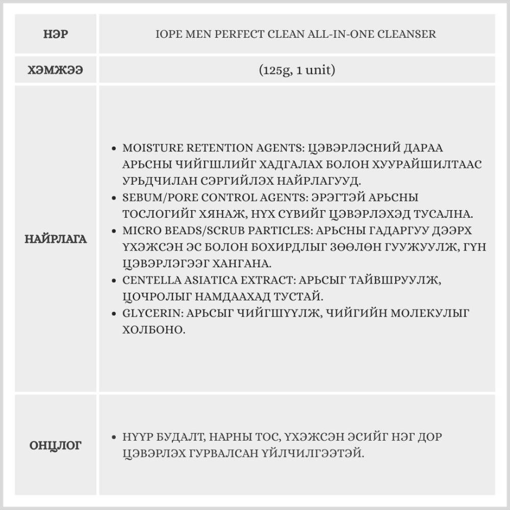 IOPE Men Perfect Clean All-in-One Cleanser 125g, 1 unit /эрэгтэй нүүр цэвэрлэгч/