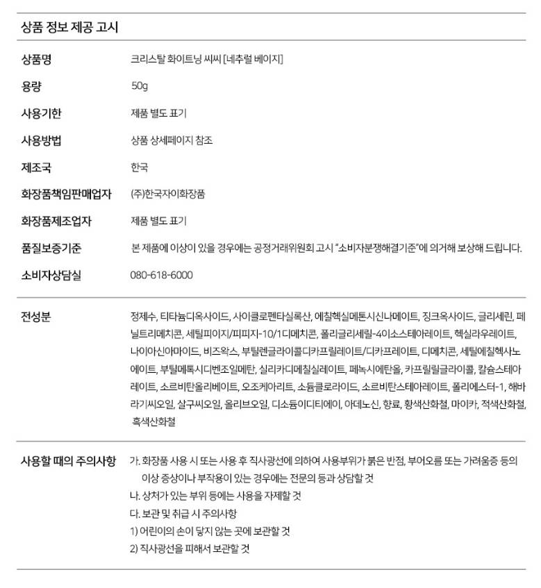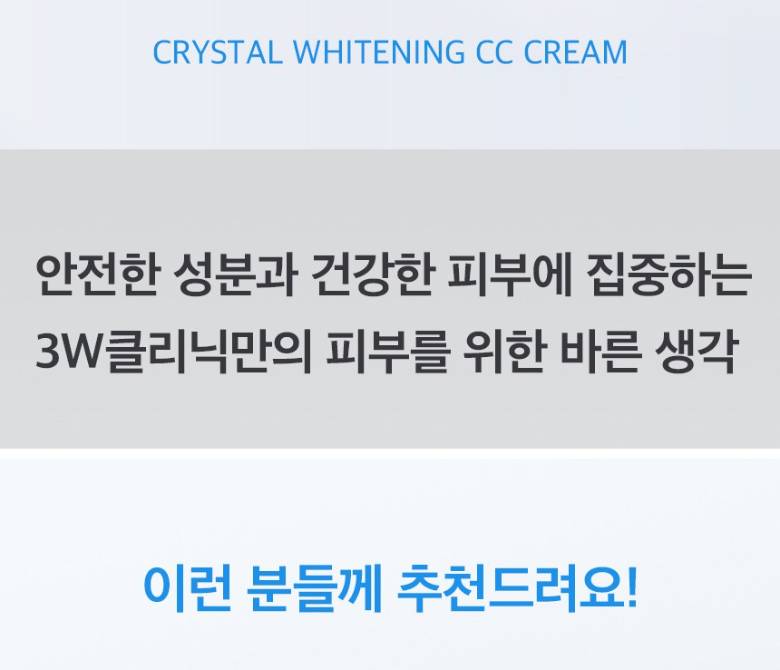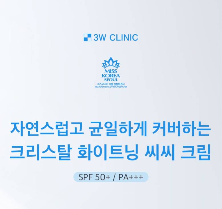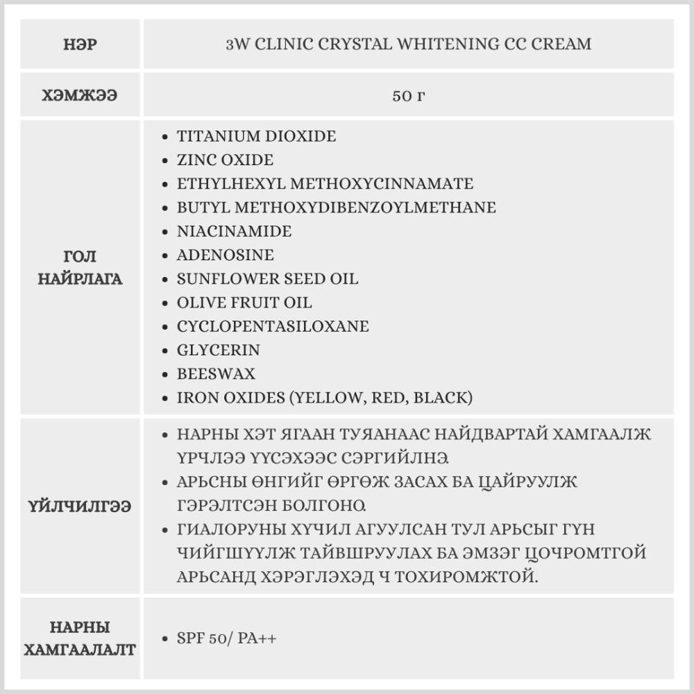 3W Clinic брэндийн Crystal Whitening CC крем нь арьсыг будалтад бэлтгэж өнгийг нь засч, арьсыг жигд гөлгөр болгохоос гадна нарны хэт ягаан туяанаас найдвартай хамгаална.