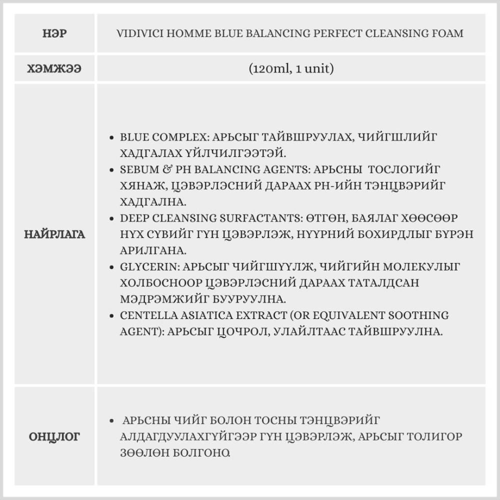 VIDIVICI Homme Blue Balancing Perfect Cleansing Foam 120ml, 1 unit /эрэгтэй нүүр цэвэрлэгч/