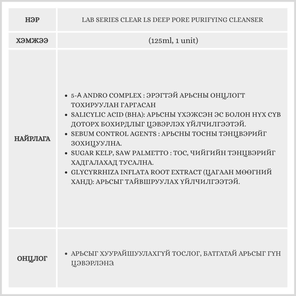 LAB SERIES CLEAR LS Deep Pore Purifying Cleanser 125ml, 1 unit /эрэгтэй нүүр цэвэрлэгч/