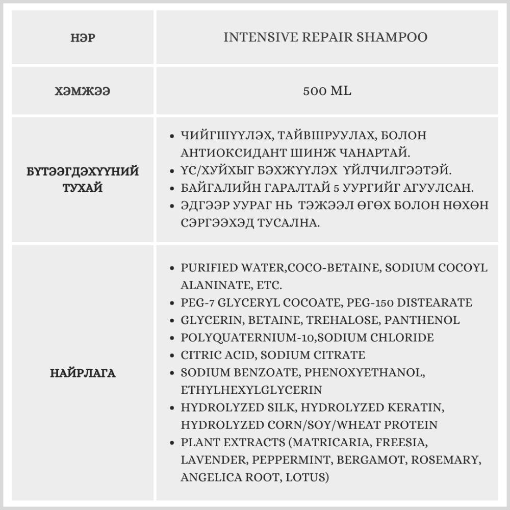 Энэхүү шампунь нь байгалийн гаралтай 5төрлийн уургийг агуулсан ба энэ нь үсийг гялалзуулан нөхөн сэргээнэ.