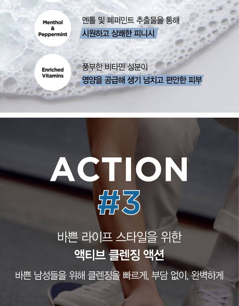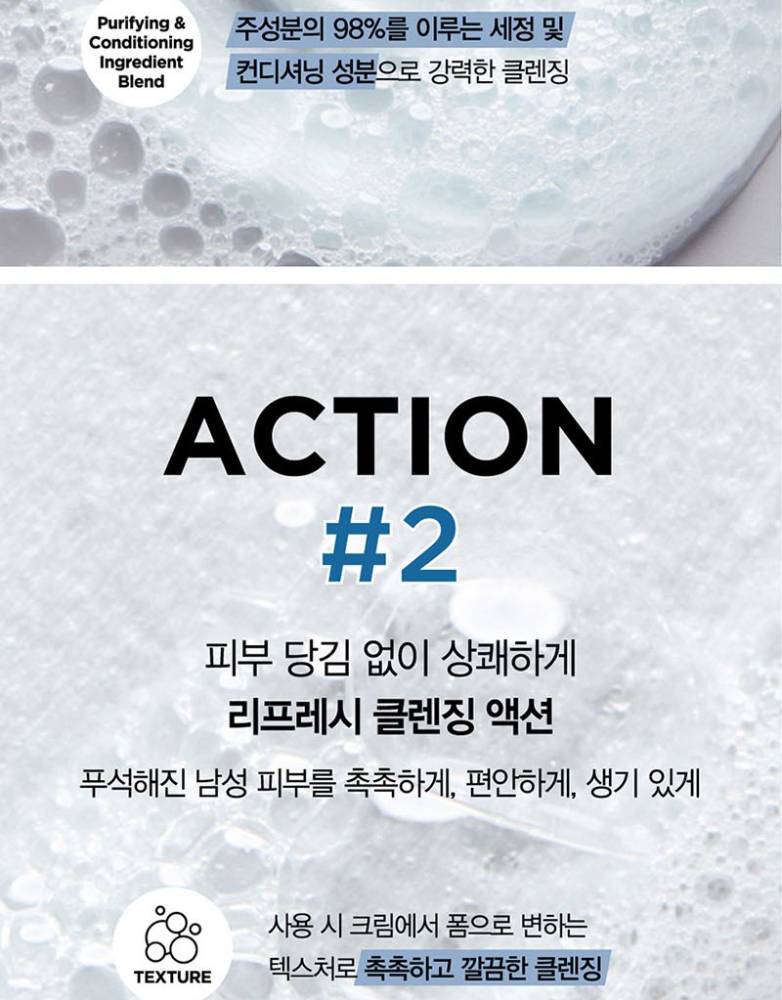 Эрэгтэйчүүдийн нүүр цэвэрлэх процессийг хялбар болгосон олон үйлчилгээт (Multi-Action) бүтээгдэхүүн юм. Энэхүү цэвэрлэгч нь нэг удаагийн угаалтаар арьсны бохирдол, илүүдэл тос, үхэжсэн эсийг арилгахын зэрэгцээ, сахал хусах үед хөөс болгон ашиглах боломжтой.