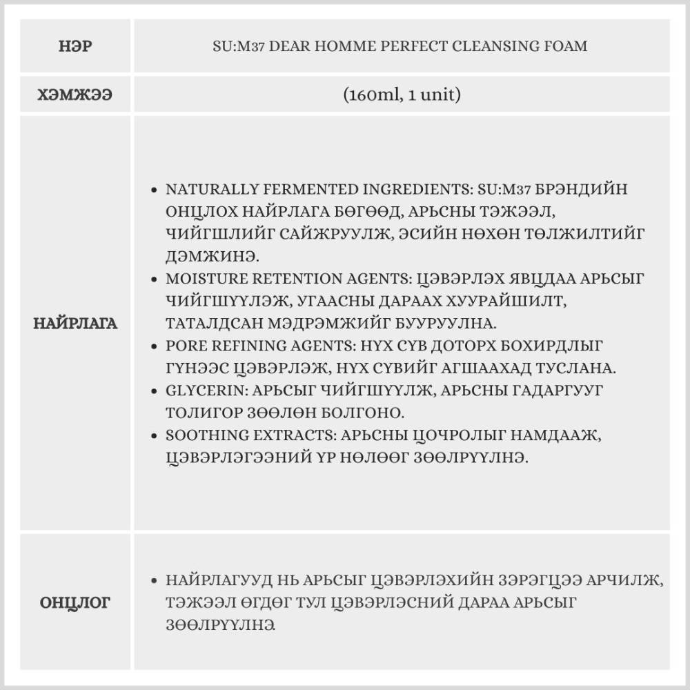 SU:M37 Dear Homme Perfect Cleansing Foam 160ml, 1 unit /эрэгтэй нүүр цэвэрлэгч/