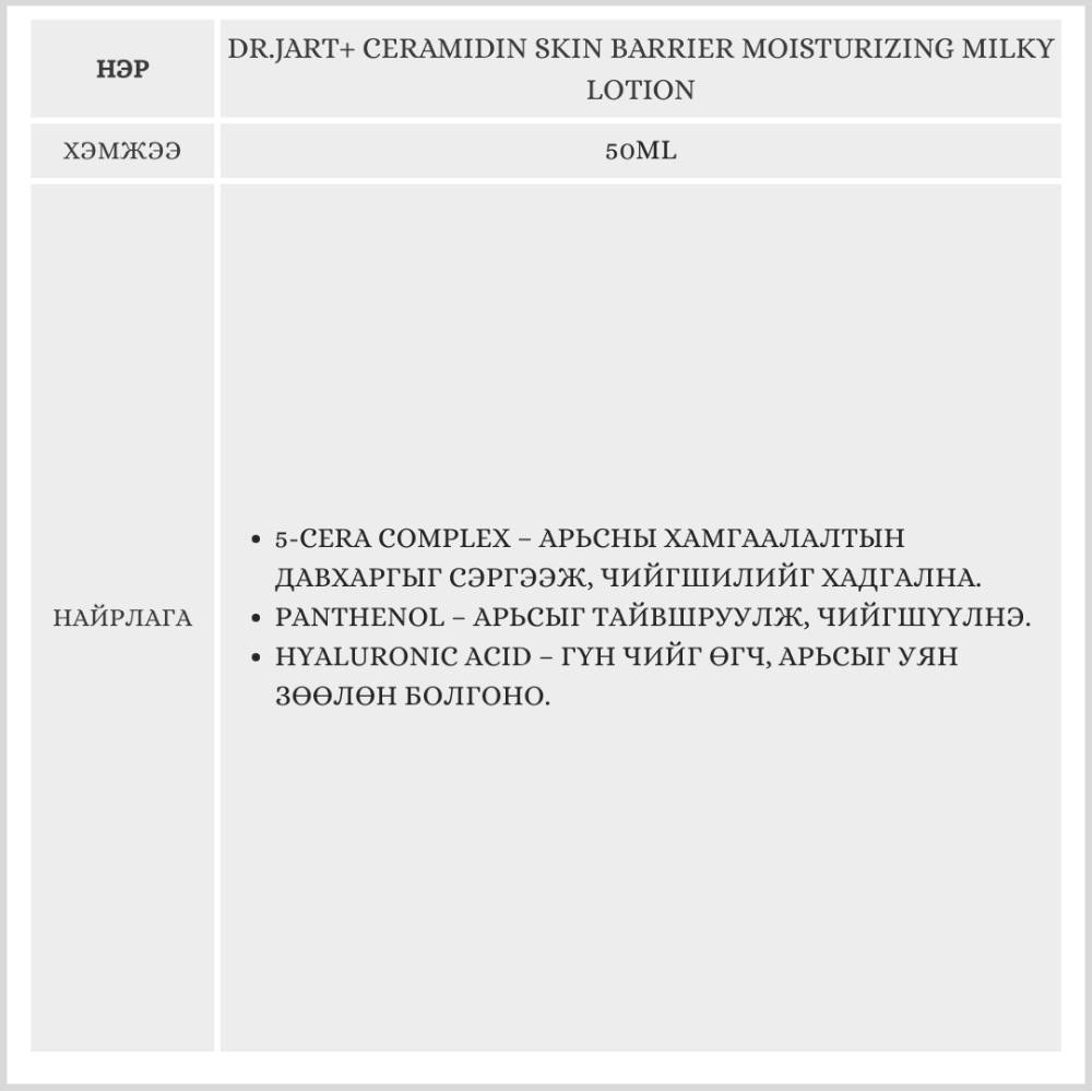 DR.JART+ CERAMIDIN SKIN BARRIER MOISTURIZING MILKY LOTION, 50ML / Нүүрний арьс арчилгаа /