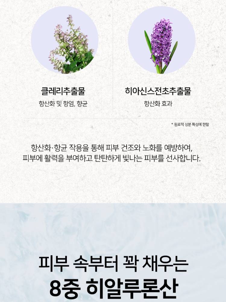 Уг бүтээгдэхүүн нь анхилуун үнэртэй ба 7төрлийн чийгшүүлэх молекул агуулсан. Арьсны гүнд чийгшүүлэн тайвшруулна.