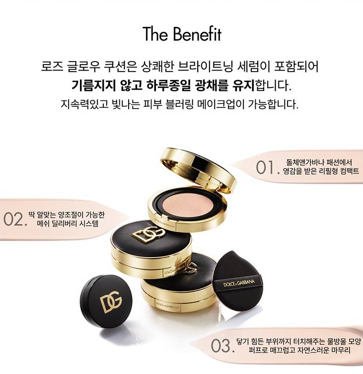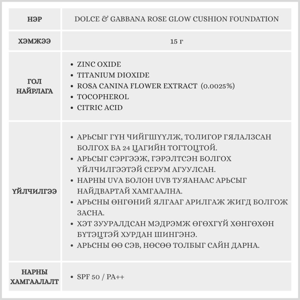 Dolce & Gabbana-гийн энэхүү Rose Glow cushion нь арьсыг чийгшүүлж, гэрэлтсэн толигор болгох хөнгөн бүтэцтэй суурь будаг юм. Өө сэвийг сайн далдлах ба арьсыг жигд өнгөтэй харагдуулна. SPF 50 PA++++ нарны хүчтэй хамгаалалттай тул өдөр тутмын хэрэглээнд тохиромжтой.