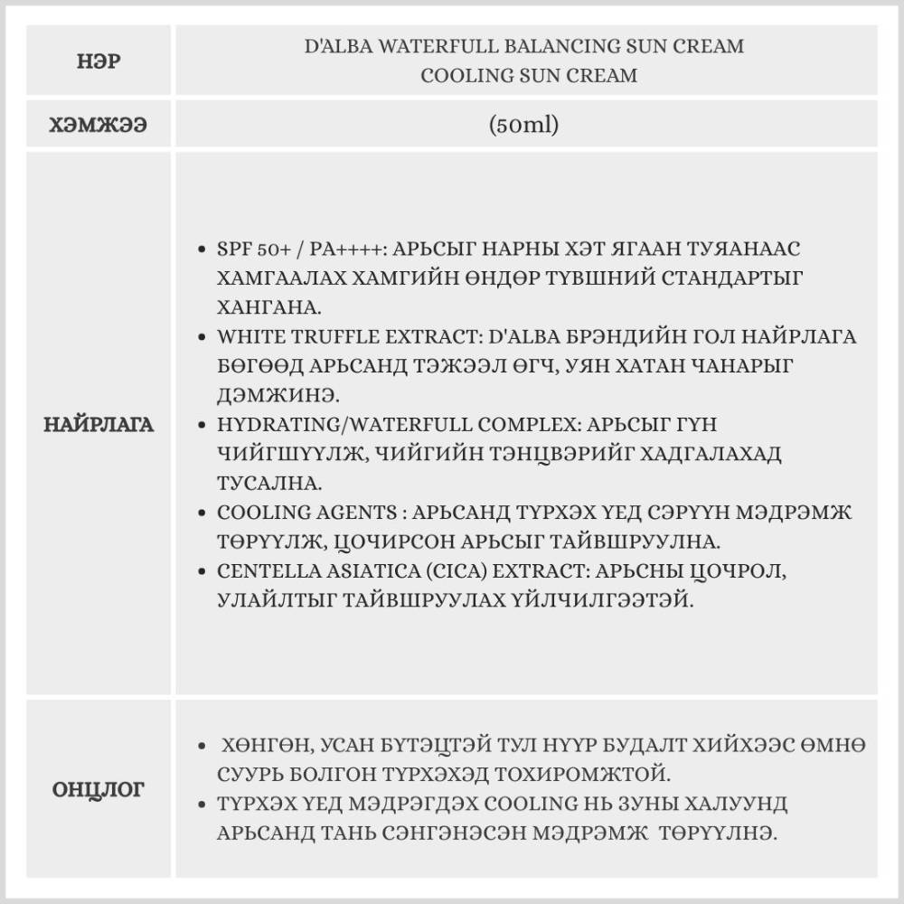 d'Alba Waterfull Balancing Sun Cream (50ml) - Cooling Sun Cream /эрэгтэй нарны тос/