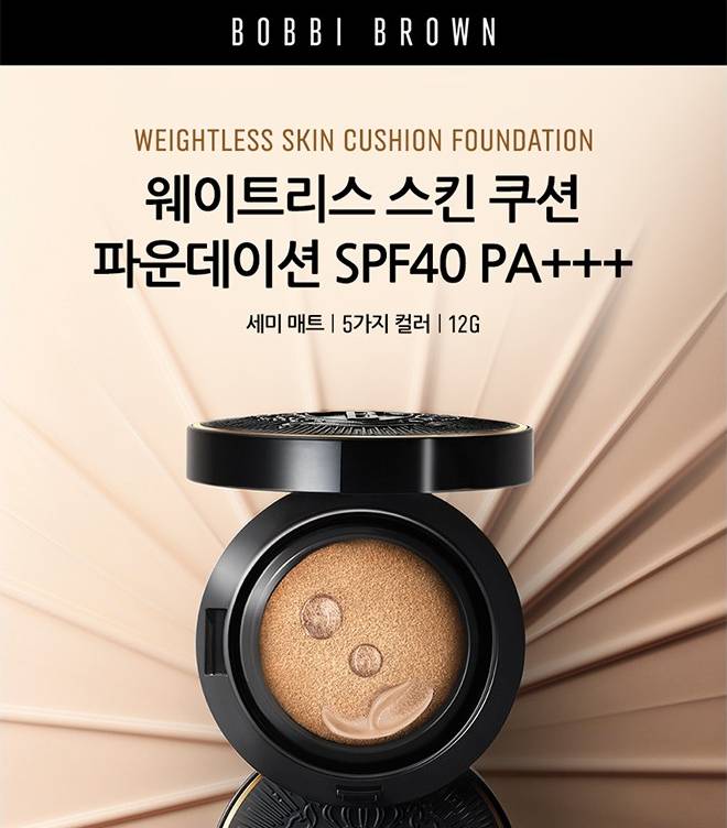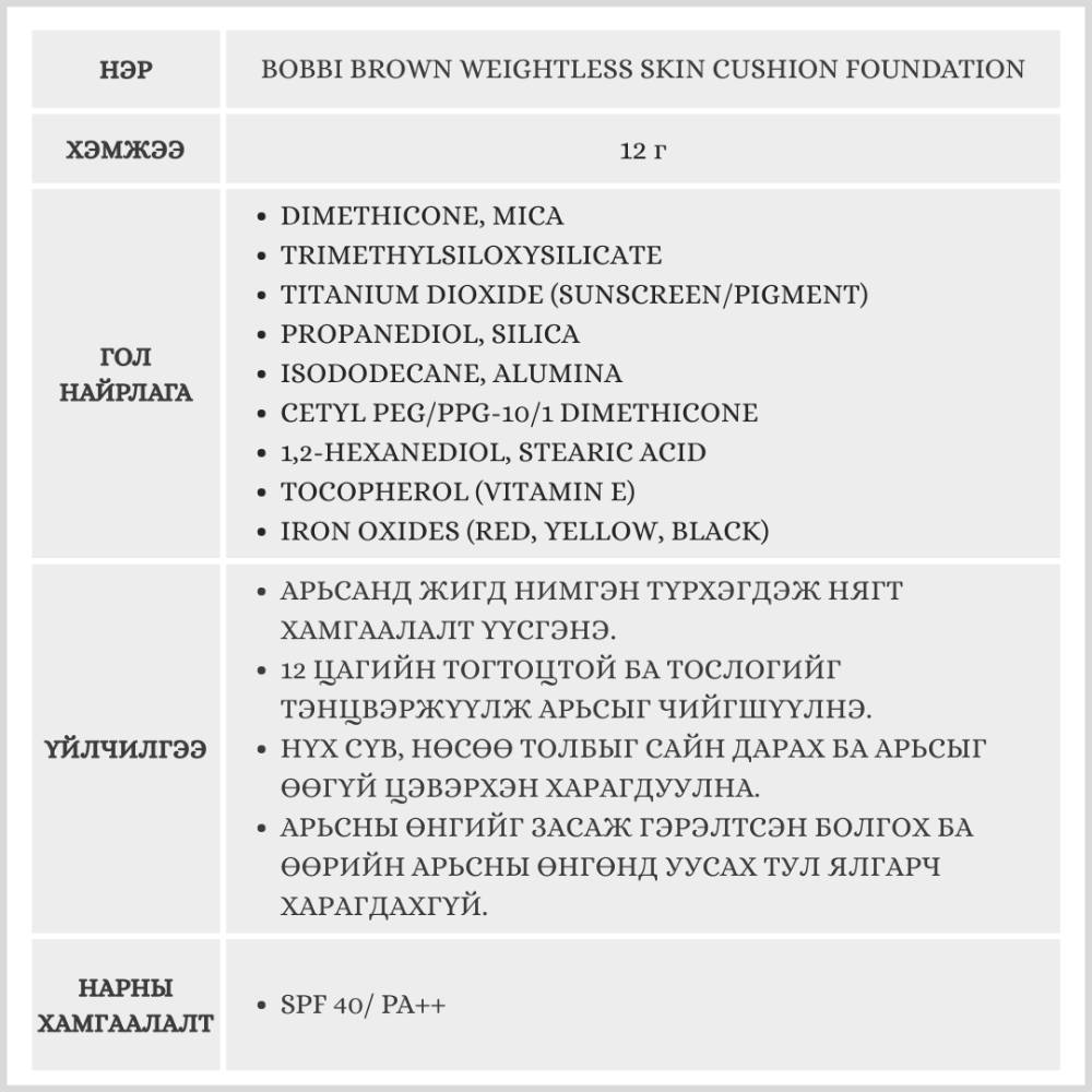 Bobbi Brown Weightless Skin Cushion нь арьсны нөсөө толбо, өө сэвийг дарж өөгүй толигор харагдуулах ба арьсны тослог болон чийгийн тэнцвэрийг хадгална. 12 цагийн тогтоцтой бөгөөд нарны хэт ягаан туяаны хамгаалалттай.