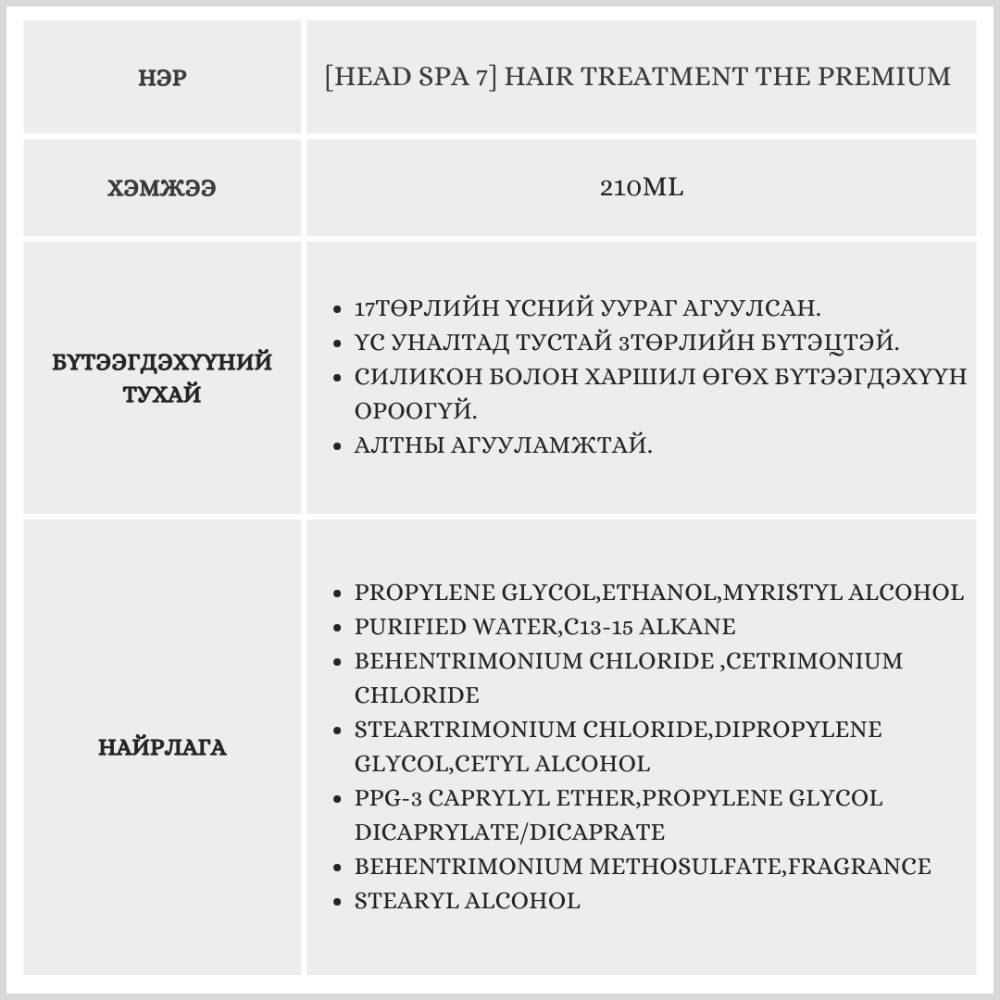[Head Spa 7] Hair Treatment The Premium 210ml /Үсний ангижруулагч/