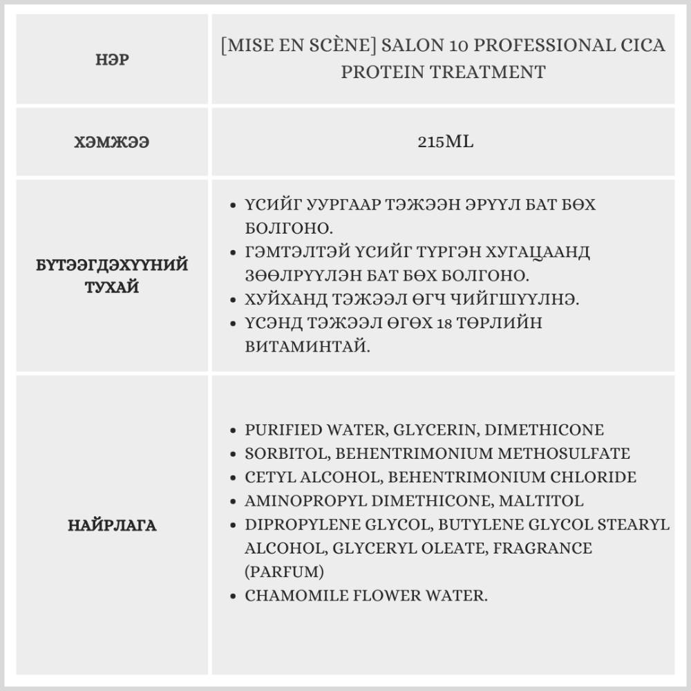 [Mise En Scène] Salon 10 Professional Cica Protein Treatment 215ml /Үсний ангижруулагч/