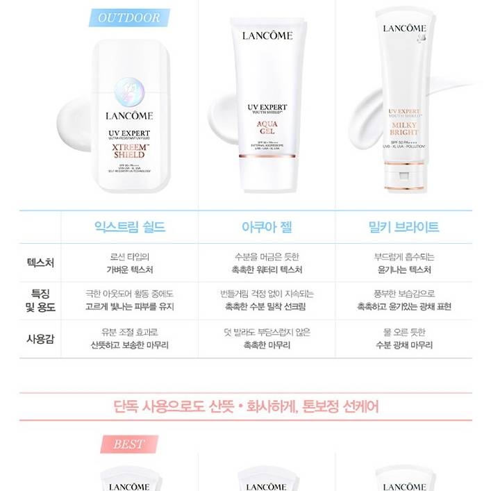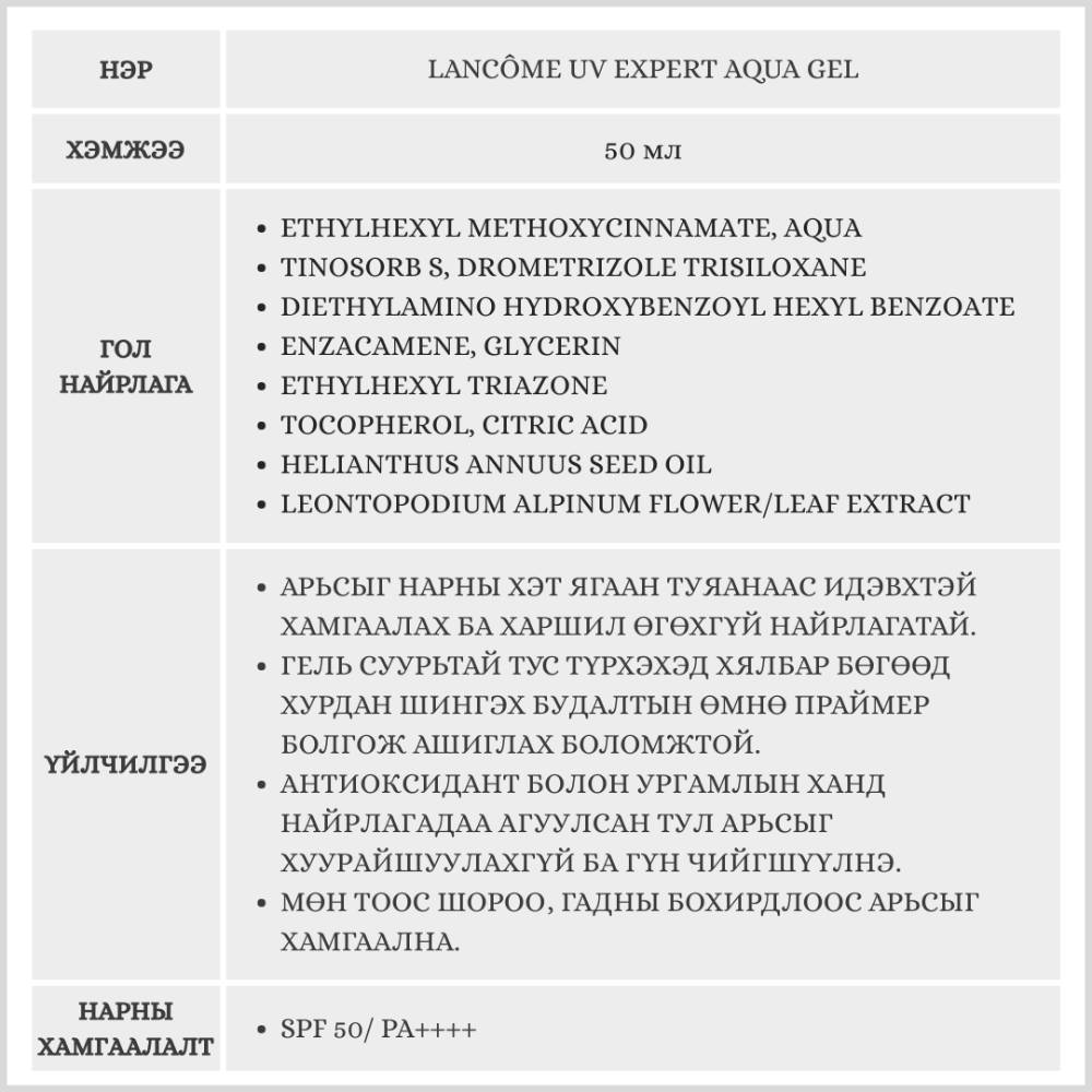 Lancôme UV Expert Aqua Gel нь гель суурьтай хөнгөн бүтэцтэй нарны тос юм. Нарны хэт ягаан туяанаас арьсыг найдвартай хамгаалахаас гадна арьсыг гүн чийгшүүлнэ. Арьсанд цагаан туяа үлдээхгүй хурдан шингэдэг тул будалтын өмнө праймер болгож хэрэглэх боломжтой.