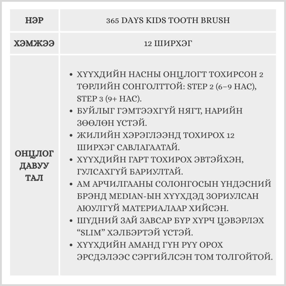 365 DAYS KIDS TOOTH BRUSH / ХҮҮХДИЙН ШҮДНИЙ СОЙЗ /