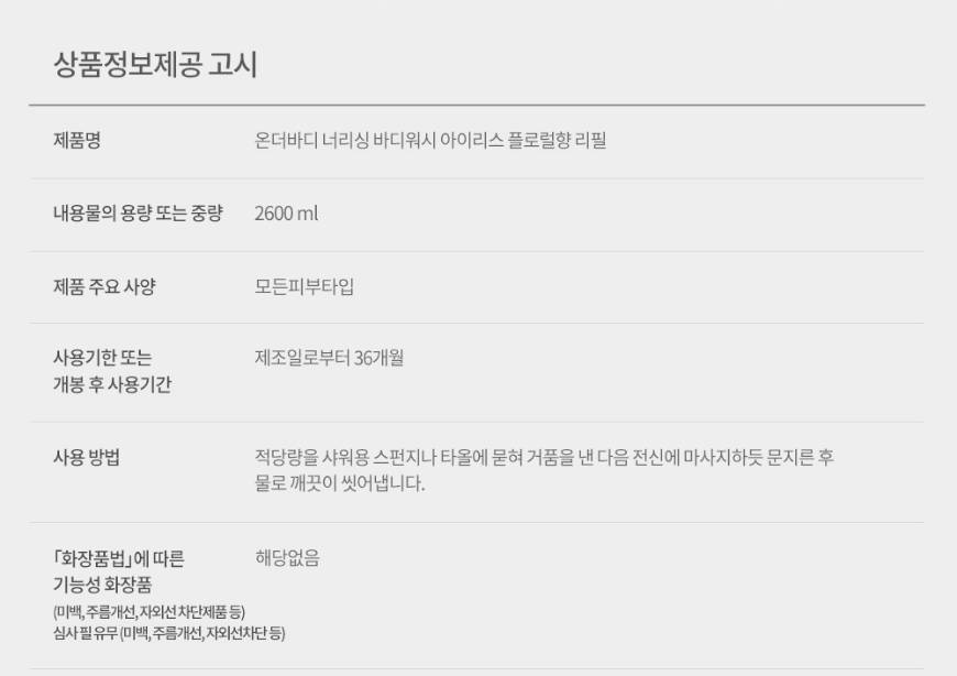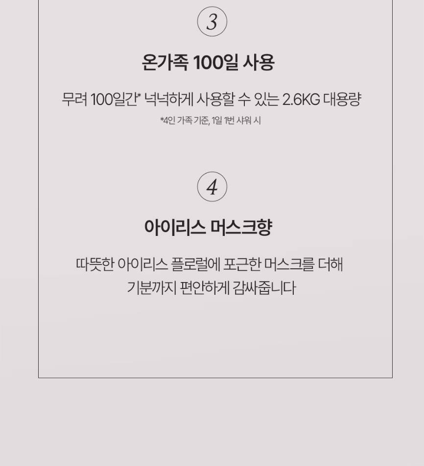 Биеийн бүх хэсэгт хэрэглэх боломжтой арьсыг гүн цэвэрлэхээс гадна давхар чийгшүүлж тэжээл өгөх үйлчилгээтэй биеийн шингэн саван. Арьсыг хуурайшуулахгүй ба зөөлөн, гөлгөр болгоно. PH багатай бөгөөд цахилдаг цэцэг болон заарын анхилуун үнэртэй. 2.6 литр хэмжээтэй тул урт хугацаанд хэрэглэгдэнэ.