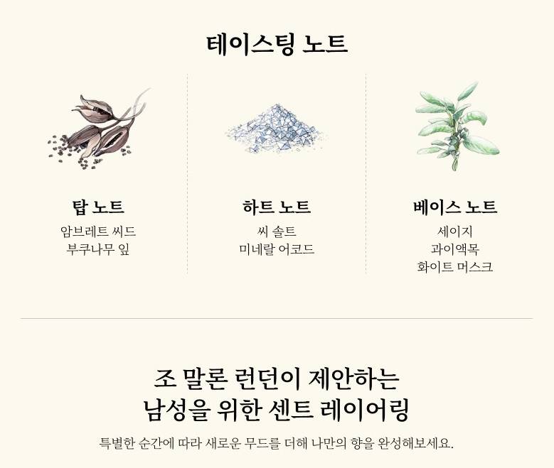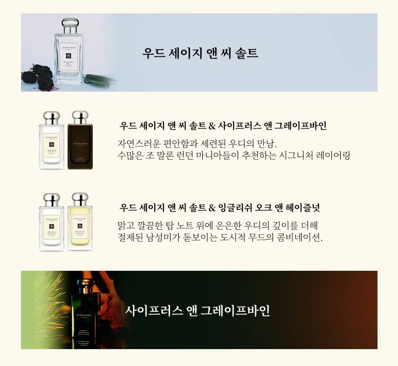 Jo Malone брэндийн үнэртэй ус нь хэт хурц биш зөөлөн үнэртэй ба удаан тогтоцтой. Woodsage & Sea Salt -> Далайн ус болон модлог ургамлын холимог шинэ үнэр Lime, basil & Mandarin -> Исгэлэн базилик болон анхилуун гангын холимог үнэр