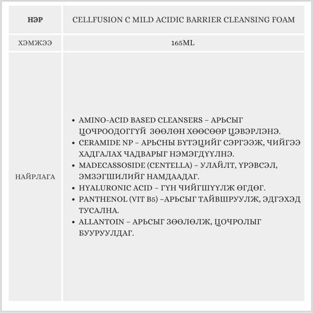 CELLFUSION C MILD ACIDIC BARRIER CLEANSING FOAM, 165ML / НҮҮР ЦЭВЭРЛЭГЧ /