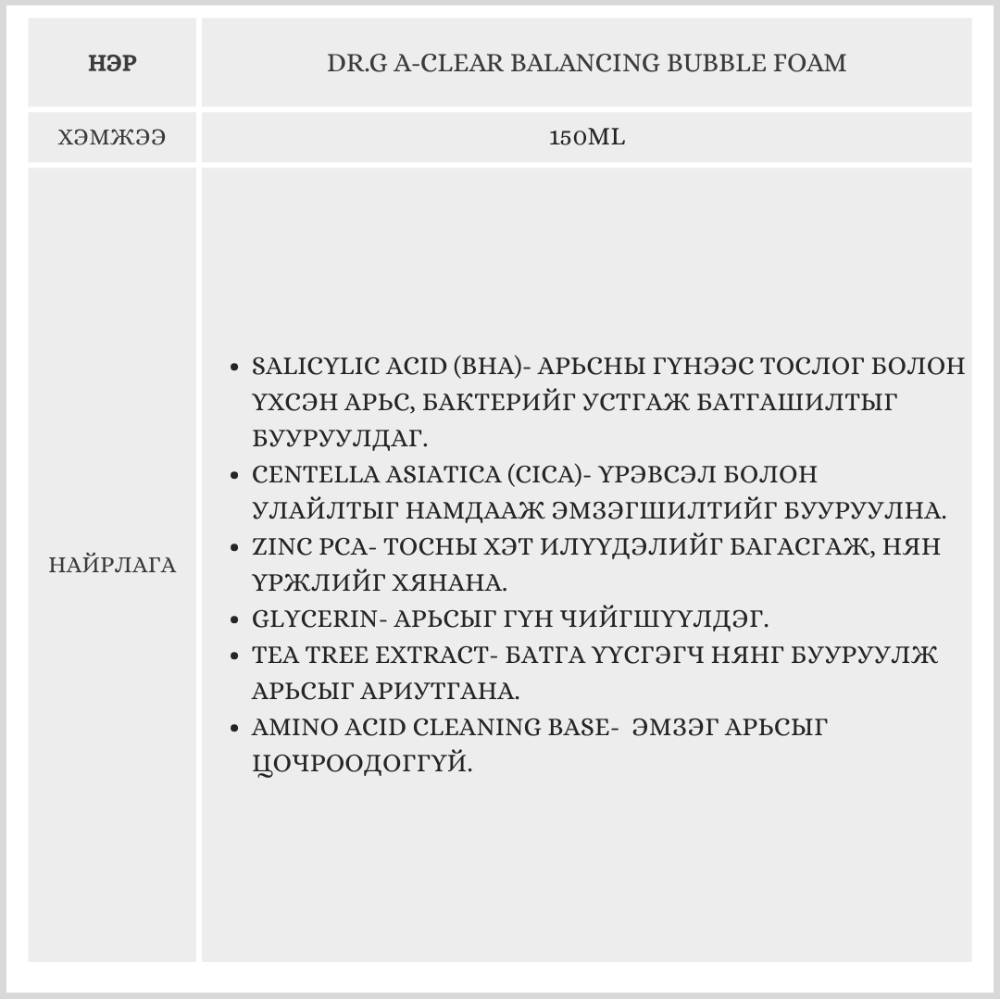 DR.G A-CLEAR BALANCING BUBBLE FOAM, 150ML / НҮҮР ЦЭВЭРЛЭГЧ /