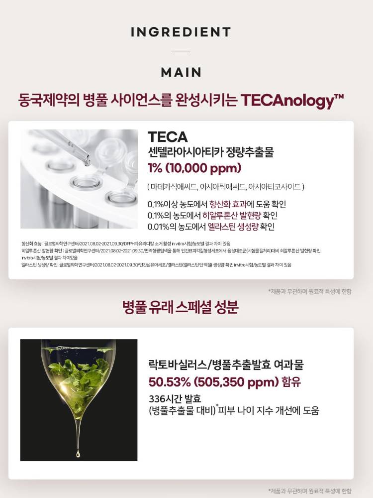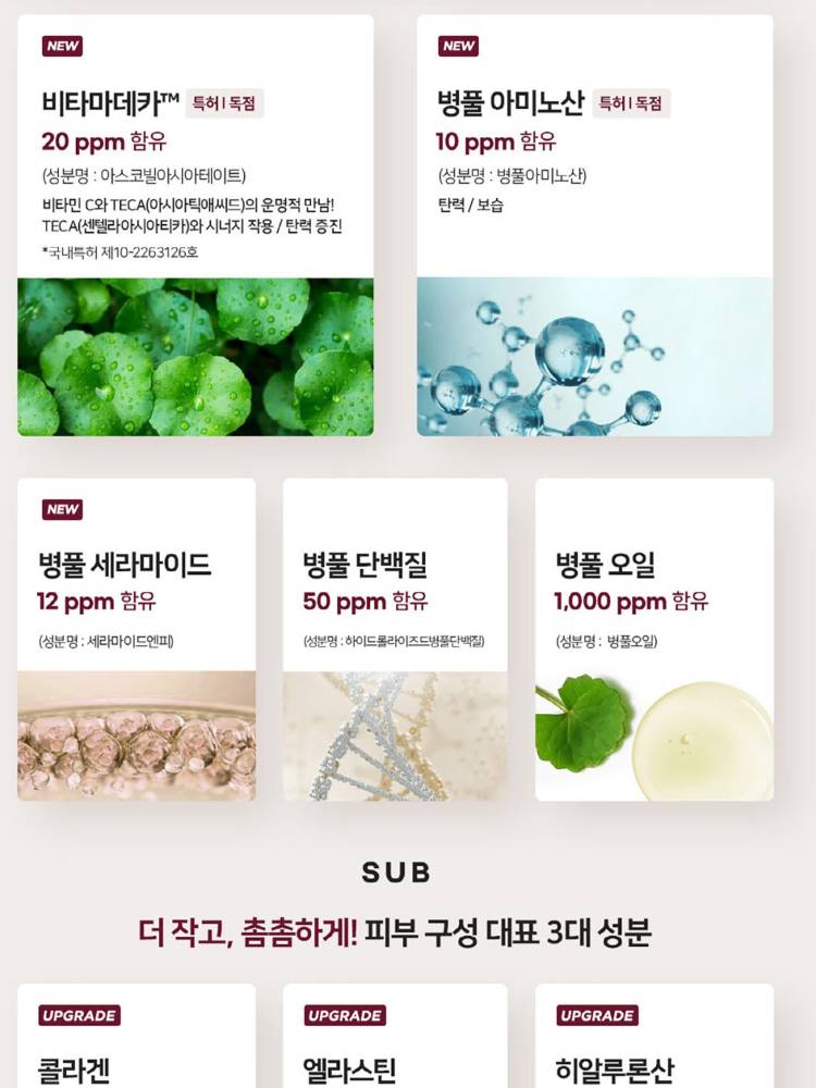 Арьсыг тайвшруулдаг 5 төрлийн Центелла Азиатика (Centella Asiatica)агуулсан. Батганы сорви, үрэвслээс үүссэн улаан толбо зэргийг бүдгэрүүлж, арьсыг тайвшруулах үйлчилгээтэй.