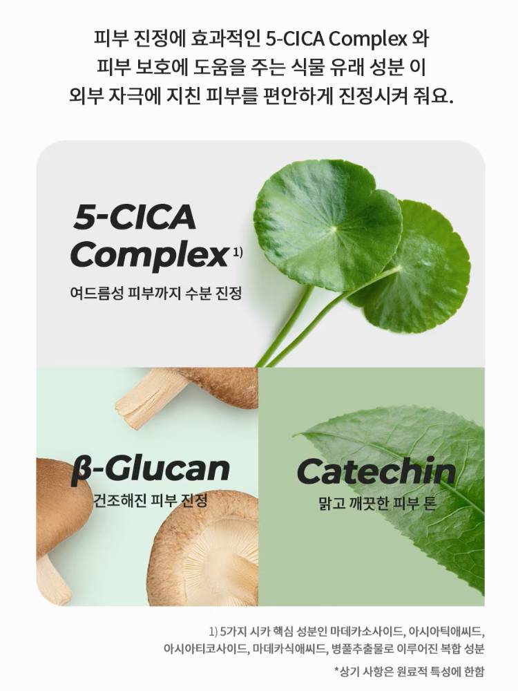 CICA (Centella Asiatica)-ийн 5 төрлийн ханд агуулсан ба арьсны улайлт, үрэвслийг бууруулна. Hypoallergenic (харшил өгөхгүй), эмзэг арьсанд зориулсан. Арьсыг тайвшруулж, улайлт болон үрэвслийг бууруулдаг ба арьсны pH-ийн тэнцвэрийг хадгалж эд эсийг сэргээнэ.