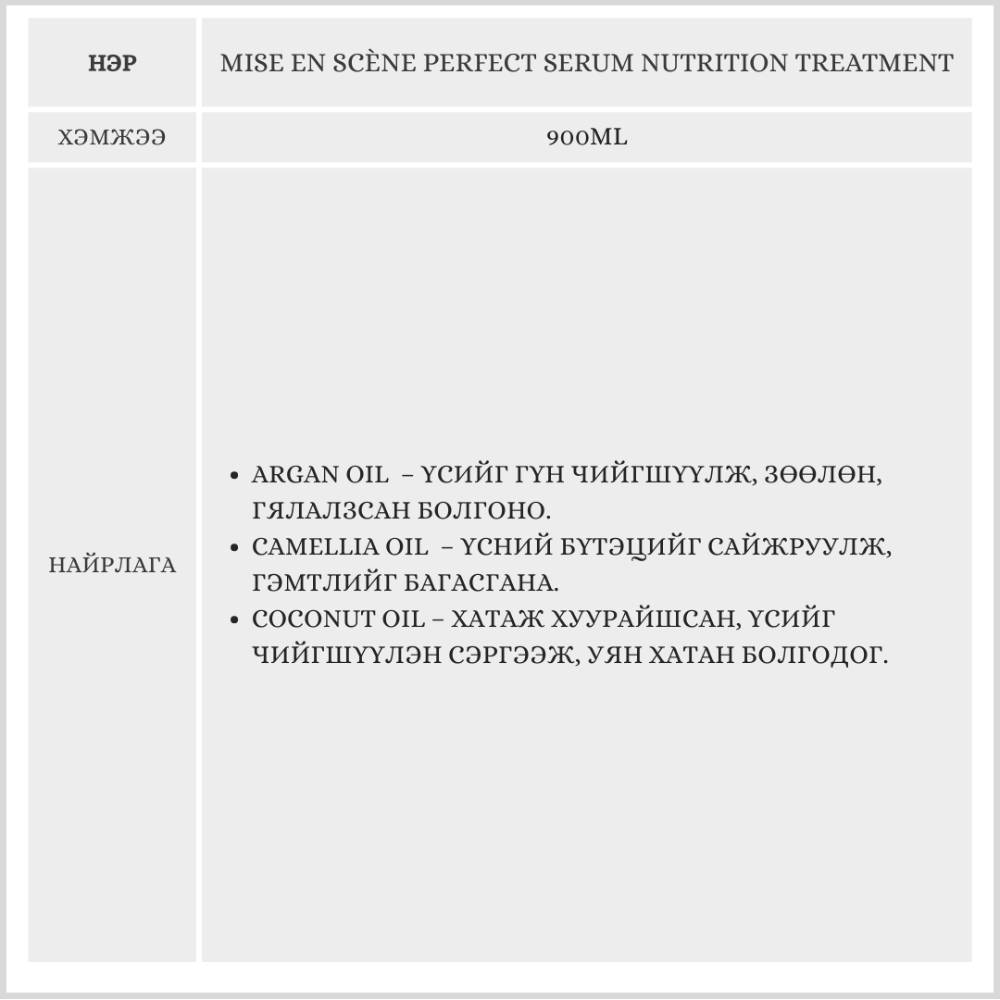 MISE EN SCÈNE PERFECT SERUM NUTRITION TREATMENT, 900ML / ҮСНИЙ АНГИЖРУУЛАГЧ /