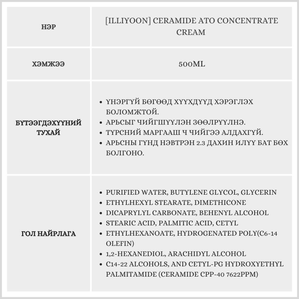 [Illiyoon] Ceramide Ato Concentrate Cream 500ML /Нүүрний чийгшүүлэх тос/