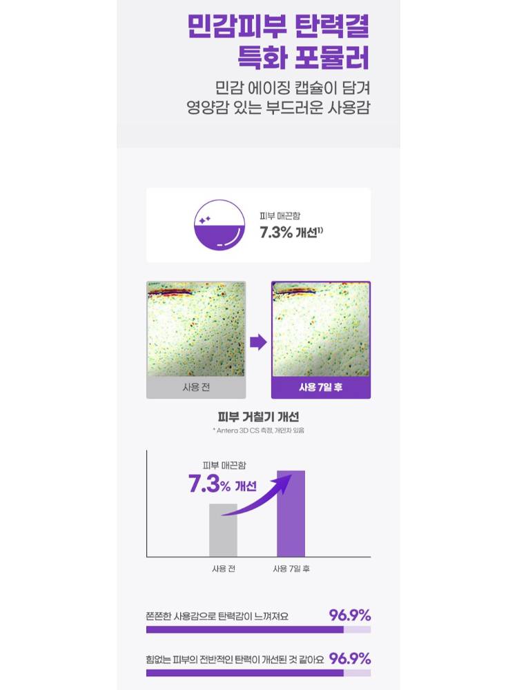 Энэхүү бүтээгдэхүүн нь эмзэг мэдрэмтгий арьсанд зориулсан ба арьсны нүхжилтийг багасган толигор болгоно. Витамин C болон коллаген агуулсан учир арьсны уян хатан чанарыг сайжруулна.