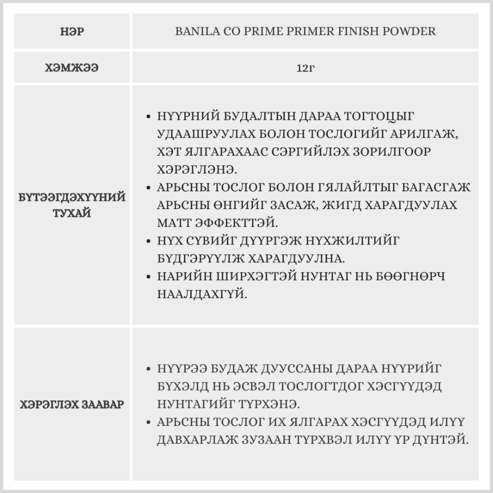 BANILA CO брэндийн нунтаг powder. Нүүр будалтын дараа нүүрний тослог болон гялгарыг арилгаж матт харагдуулах ба нүүрний будгийг удаан тогтоцтой болгоно.