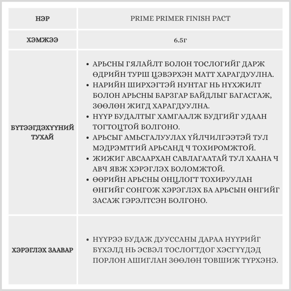 Арьсыг тослоггүй, жигд харагдуулах нүүр будалтын төгсгөлийг хийх зориулалттай pact. Нүхжилтийг бүдгэрүүлж, будгийн тогтоцыг уртасгах ба өдрийн турш цэвэрхэн матт харагдуулна.