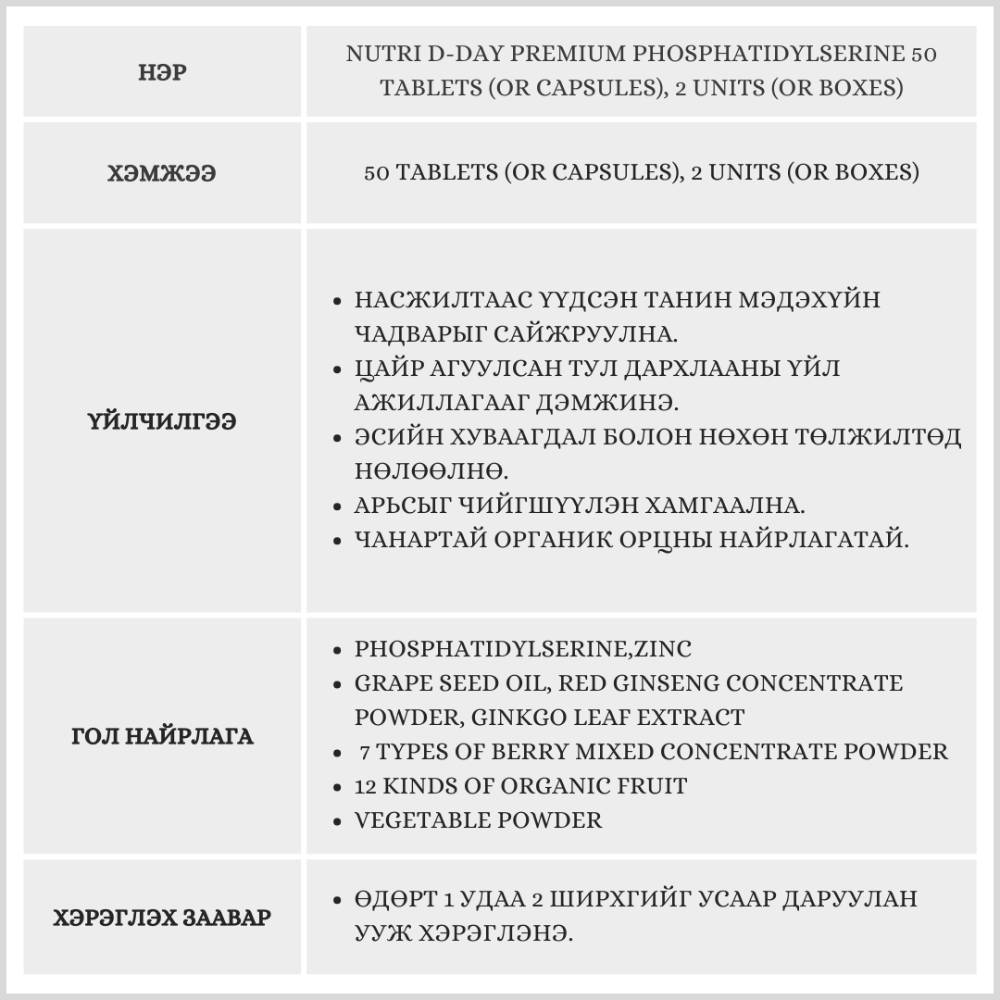 Nutri D-Day Premium Phosphatidylserine, 50 Tablets (or Capsules), 2 Units (or Boxes) /Тархины тэжээл/